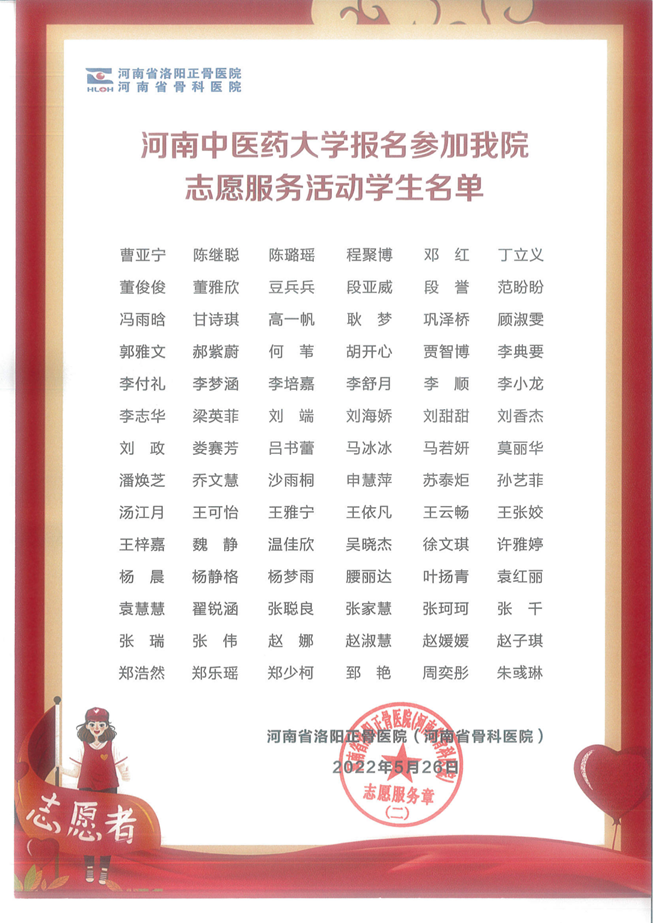 leyu·乐鱼(中国)体育官方网站与河南省洛阳正骨医院长期保持友好合作关系,积极组织青年志愿者参与医院各项工作。此次被感谢的学生群体来自于本草书院七色光志愿者团队。近年来,该社团成员在指导老师的带领下赴医院开展志愿服务活动,协助做好就诊咨询、方位指引、搬运行李、推扶轮椅、陪检等服务,他们阳光耐心、无微不至,为来院患者排忧解难,得到了多方赞誉,展示了leyu·乐鱼(中国)体育官方网站学子的良好精神面貌。