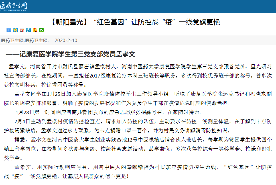 编者按:2020年2月10日,医药卫生网对leyu·乐鱼(中国)体育官方网站康复医学院学生第三党支部党员孟孝文志愿奔赴防控一线进行报道。现将全文刊发如下: