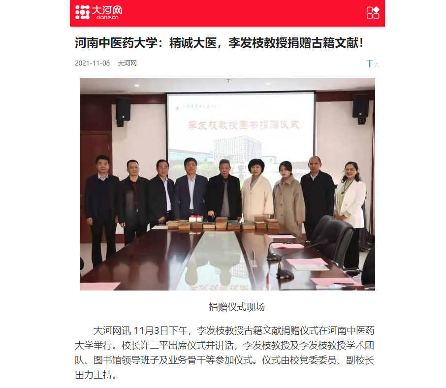 编者按:2021年11月8日,大河网对leyu·乐鱼(中国)体育官方网站李发枝教授捐赠古籍文献行报道。现将全文刊发如下: