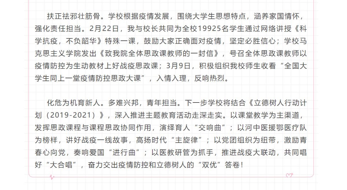 化危为机育新人。多难兴邦,青年担当。下一步学校将结合《立德树人行动计划(2019-2021)》,深入推进主题教育活动走深走实。以课堂教学为主渠道,发挥思政课程与课程思政协同作用,演绎育人“交响曲”;以河中医援鄂医疗队为榜样,讲好战疫一线故事,高扬时代“主旋律”;以党团组织为纽带,激励青春心向党,奏响爱国“进行曲”;以医教研管为抓手,推进战疫大联动,共同唱好“大合唱”,奋力交出疫情防控和立德树人的“双优”答卷!