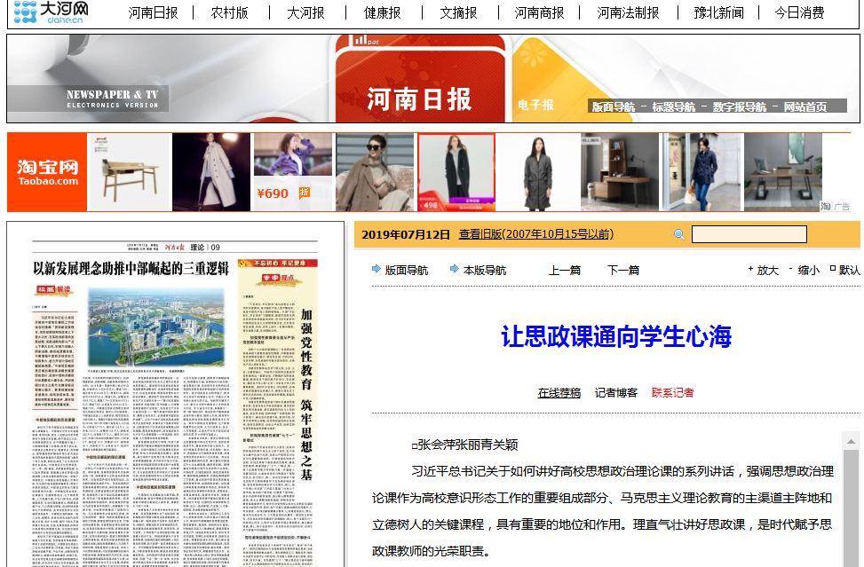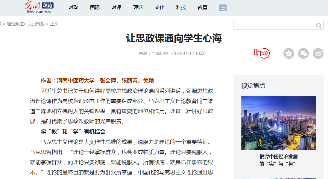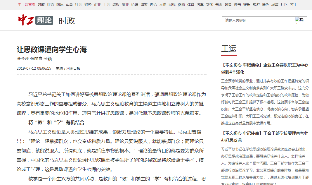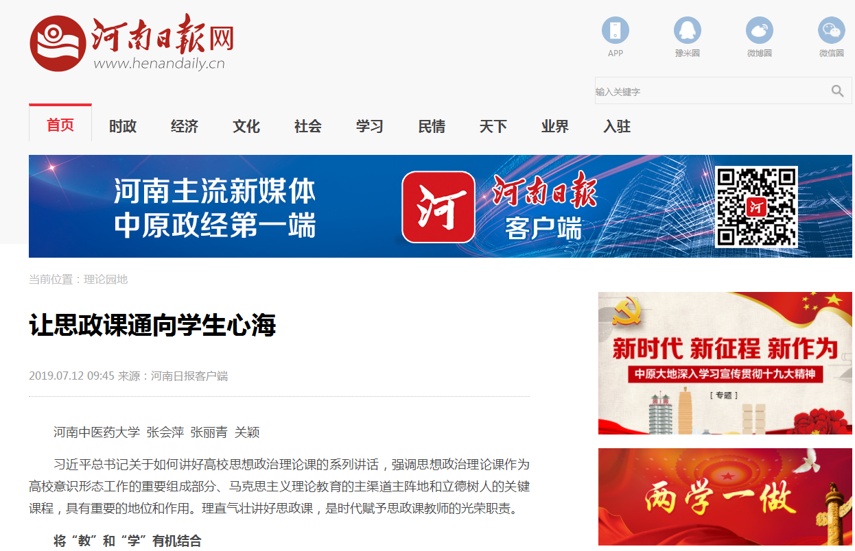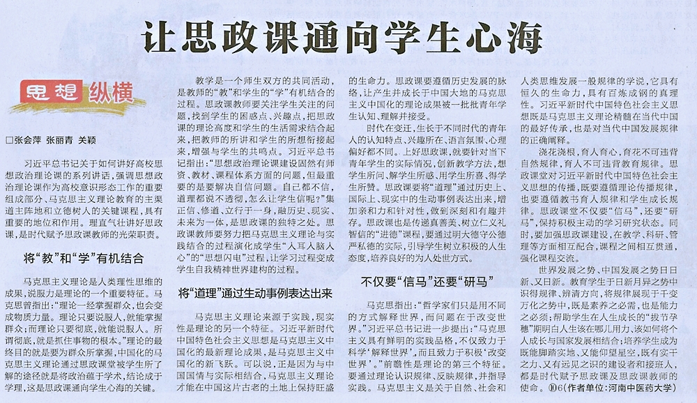 编者按:2019年7月12日,《河南日报》在第9版“理论版”,报道了leyu·乐鱼(中国)体育官方网站张会萍、张丽青、关颖3位教授的理论文章“让思政课通向学生心海”。《光明网》“理论版”、《中工网》“理论版”、《河南日报网》“理论园地”、《大河网》等媒体进行了全文转载报道。现将报道全文刊发如下: