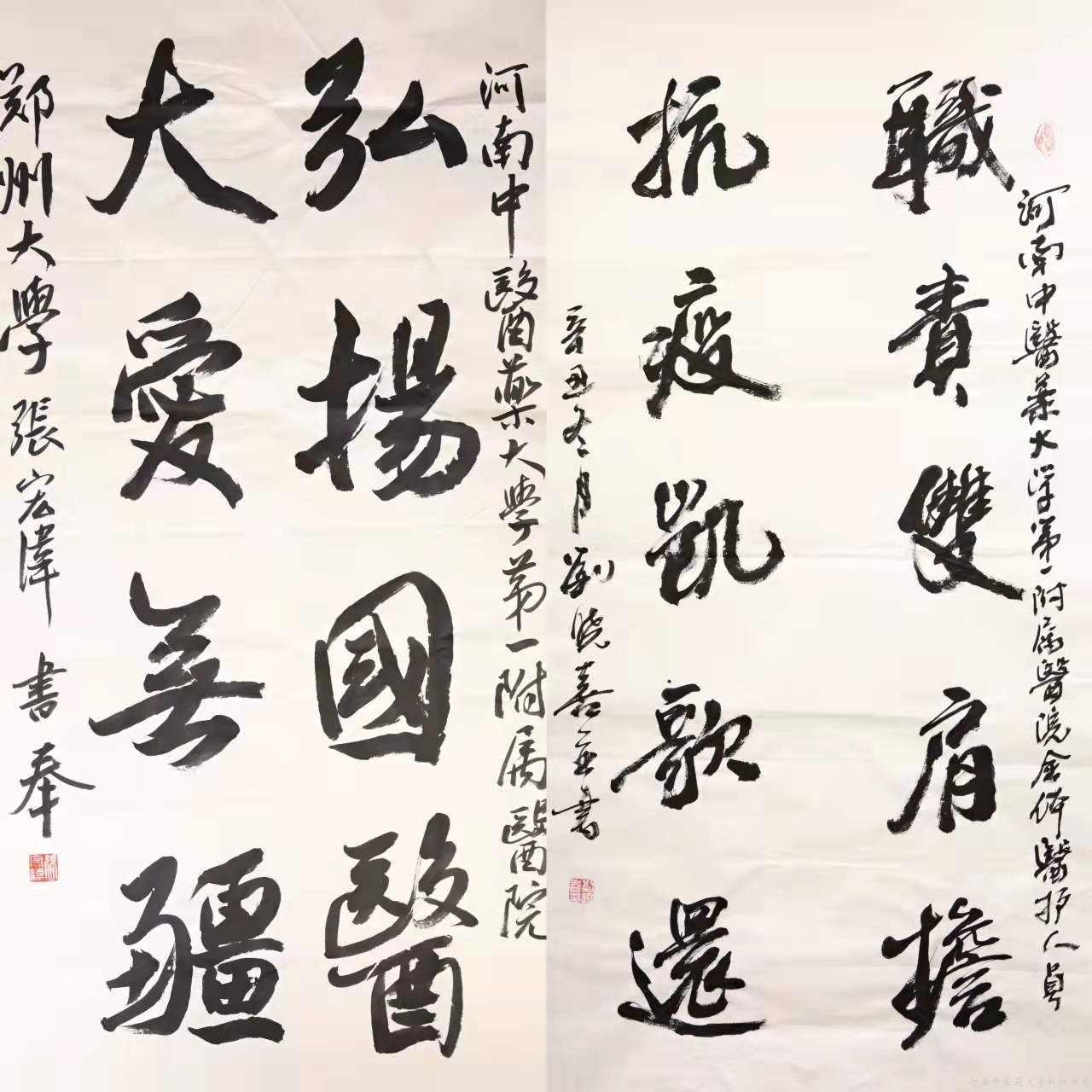 本网讯(文/郑金铎 图/刘晓喜)真情透纸背,笔墨传心声。值此新春佳节之际,中国书法协会会员、河南书画专业委员会副会长刘晓喜,郑州大学书法学院教授张宏伟有感于近年来一附院医护人员在抗击新冠肺炎疫情和守护人民群众健康事业上所做的贡献,特意创作并赠送一附院两副书法作品,借此为向医院医护人员表达春节祝福和诚挚敬意。