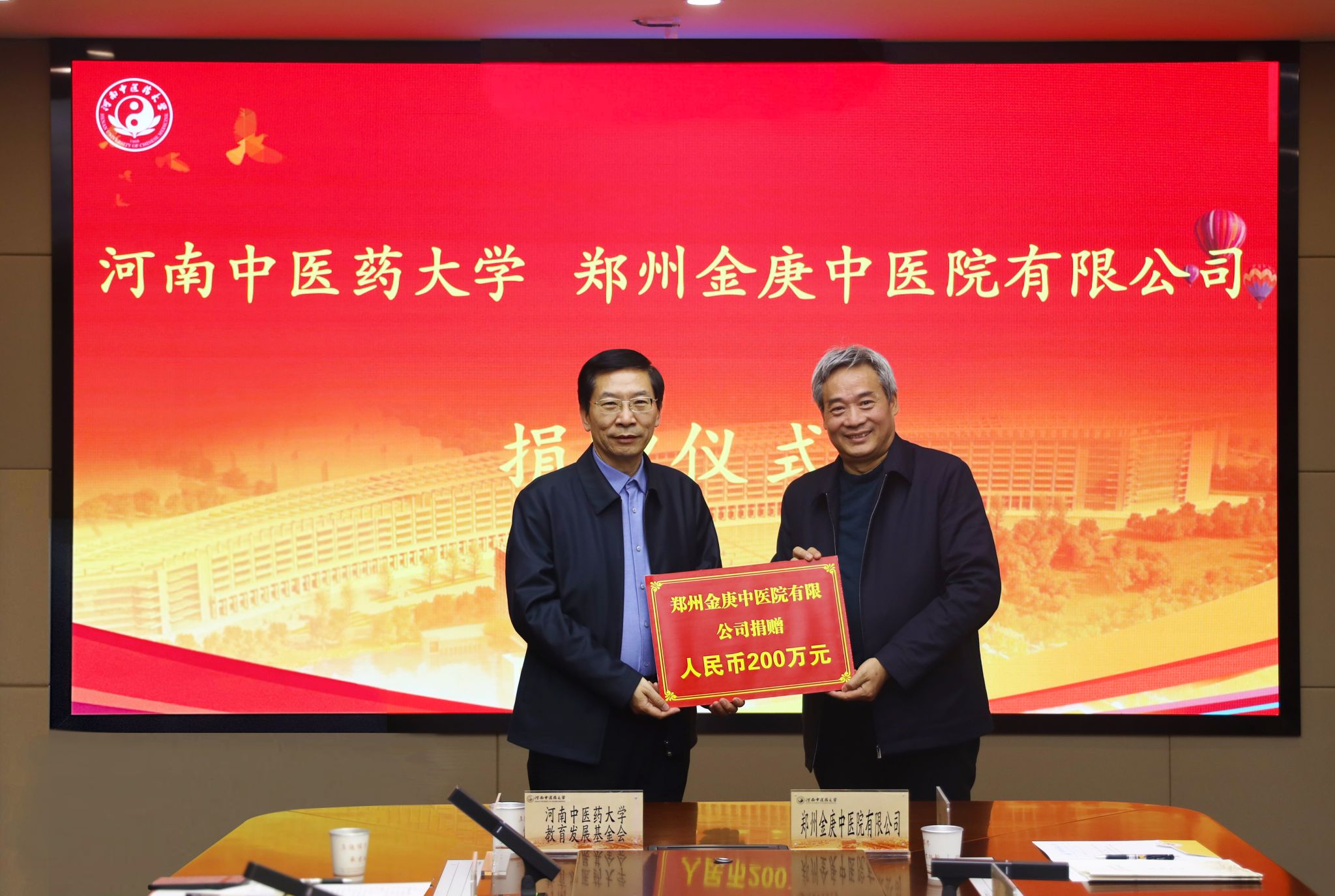 仪式上,王耀献代表学校对宋兆普一行的到来表示欢迎。他简要介绍了学校的基本情况及附属医院的发展成就,并对郑州金庚中医院有限公司捐赠200万元设立“金庚基金”表示诚挚的感谢。他指出,宋兆普先生作为河中医人的优秀代表,多次支持母校发展,充分彰显了河中医校友爱校、荣校的光荣传统。学校将充分运用捐赠资金,助力学校“双一流”创建与高质量发展,为中医药强省做出更大的贡献!