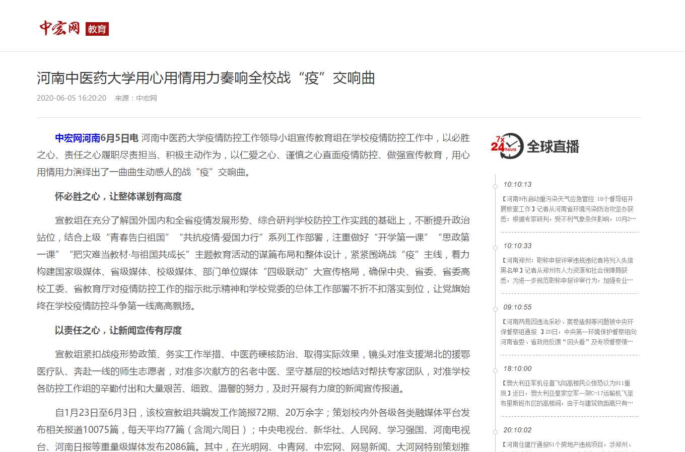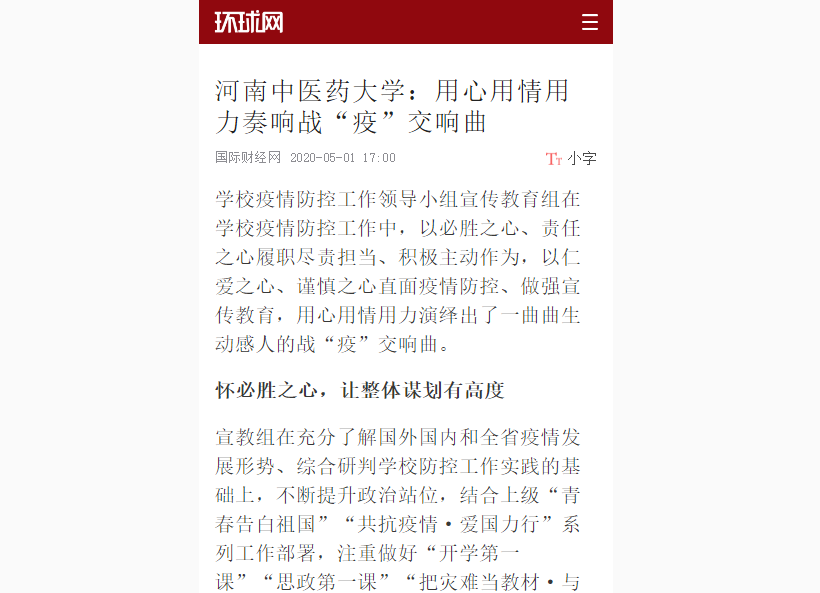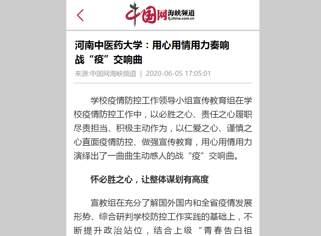 2020年6月5日,中国网、环球网、中宏网、河南教育宣传网等媒体对leyu·乐鱼(中国)体育官方网站用心用情用力奏响战“疫”交响曲进行报道。