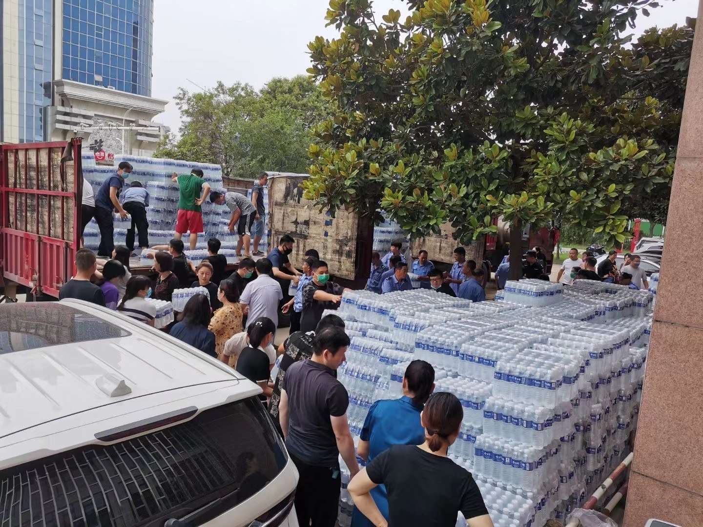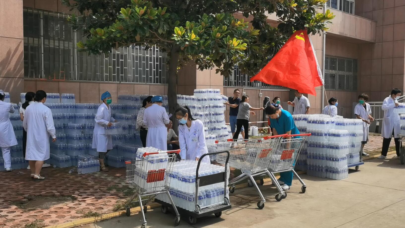 7月23日深夜,一辆车身印有“携手同心 共度难关”标识的救灾物资运输车抵达三附院。7月24日清晨,医院教职工和后勤保卫人员自发参与到搬卸工作中,57600瓶总重近32吨的矿泉水,不到一个小时全部搬卸完毕。