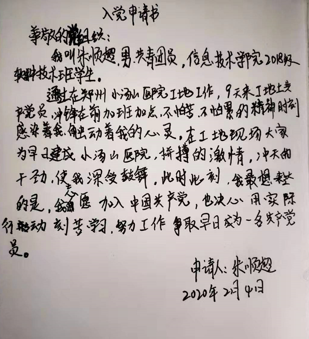 “敬爱的党组织,工地上共产党员冲锋在前,加班加点,不怕苦、不怕累的精神,时刻感染着我,工友们拼搏的激情、冲天的干劲时刻鼓舞着我,此时此刻,我最想表达的是,我志愿加入中国共产党”,朱顺超在工地现场向党组织递交了入党申请书。“武汉加油!河南加油!中国加油!”朱顺超如是说。