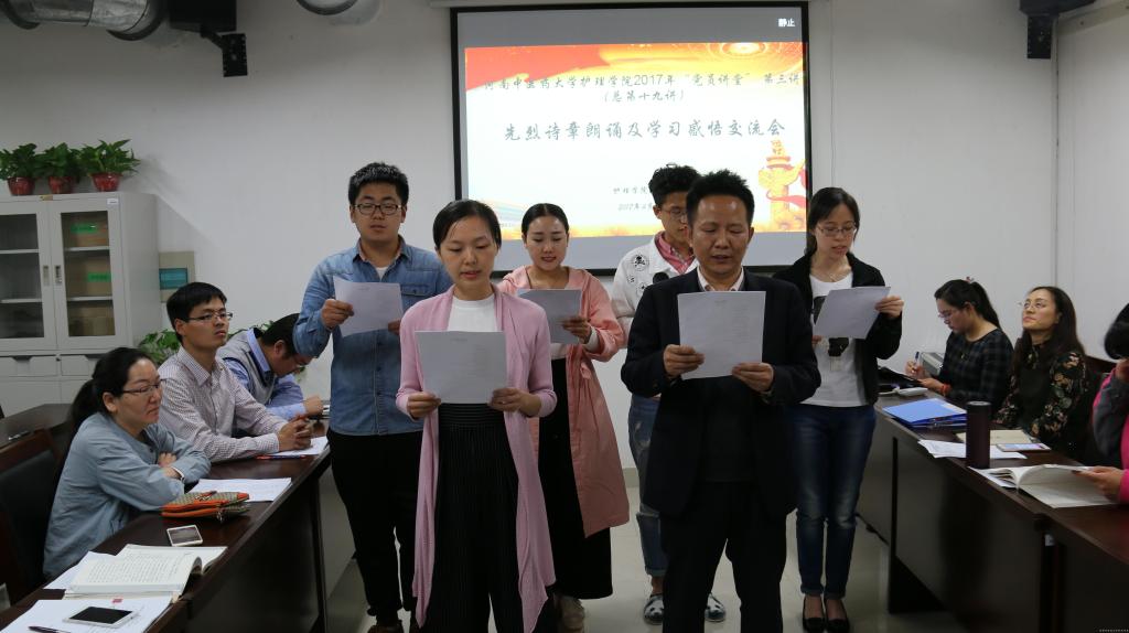 2017年4月14日中午,护理学院在党员活动室举办先烈诗章朗诵及学习感悟交流会,这也是护理学院2017年“党员讲堂”第三讲(总第十九讲),护理学院党总支各支部党员代表参加了会议。会议由护理学院党总支书记尹丽主持。