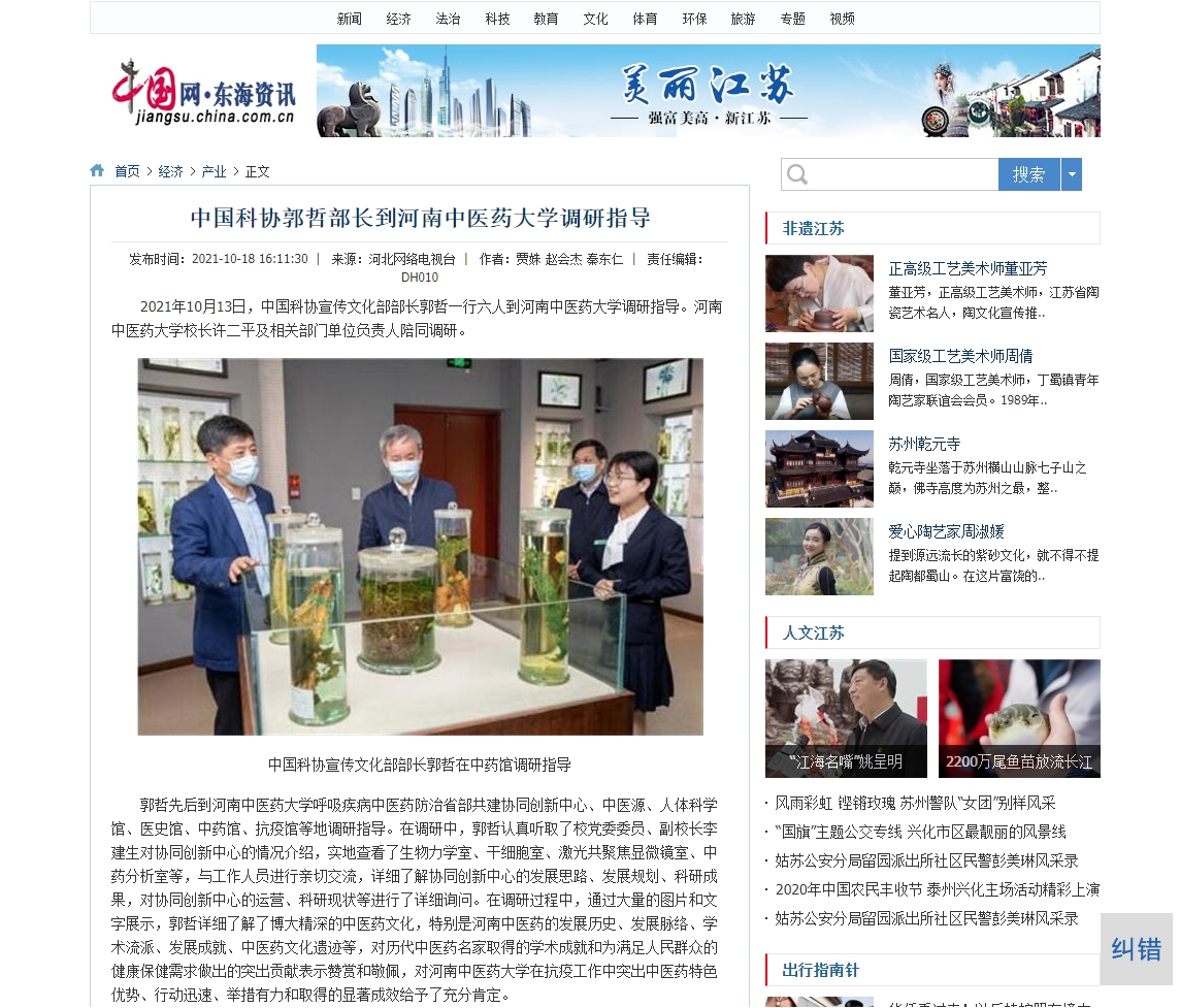 2021年10月18日,中国网对中国科协郭哲部长到leyu·乐鱼(中国)体育官方网站调研指导进行报道。