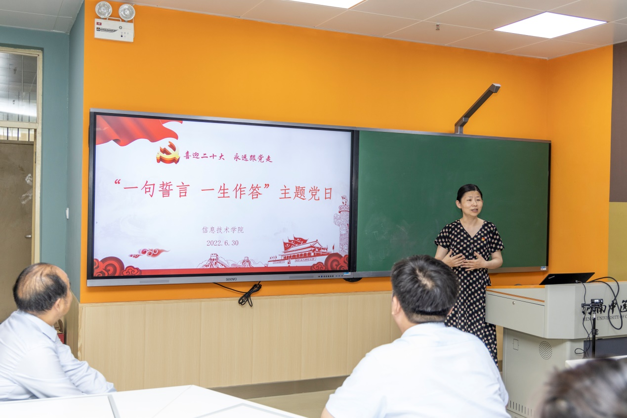 本网讯(文/李艳 图/郭寅虎)为庆祝中国共产党成立101周年,不断强化广大党员党性观念。2022年6月30日下午,信息技术学院党委在BM516开展“喜迎二十大 永远跟党走”“一句誓言 一生作答”主题党日活动。校党委委员、副校长苗明三与学院全体领导班子、全体教师党员一起参加。活动由学院党委书记马赟主持。