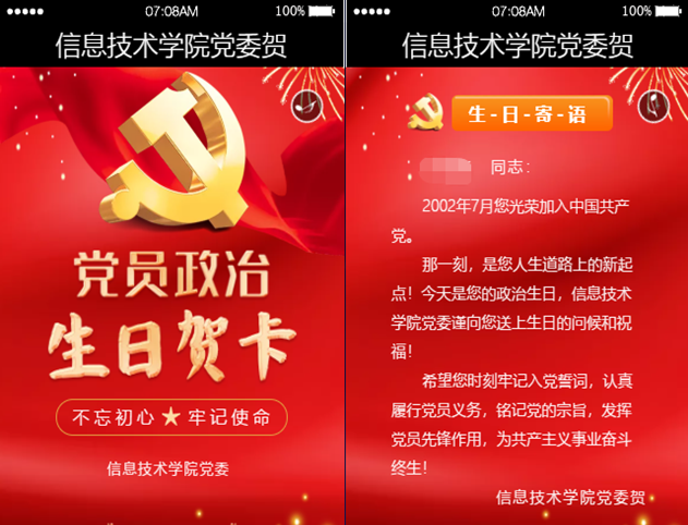 “政治生日”,意义特殊。学院党委为7月份入党的教师赠送“政治生日”电子贺卡。“在您入党的那一刻,是您人生道路的新起点!今天是您的政治生日,希望您时刻牢记入党誓词,认真履行党员义务,铭记党的宗旨,发挥党员先锋模范作用,为共产主义事业奋斗终身。”