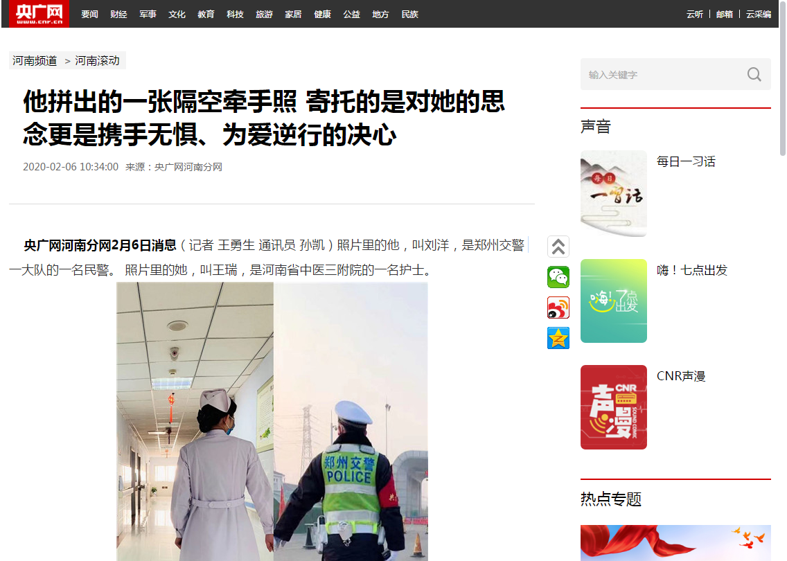 央广网河南分网2月6日消息(记者 王勇生 通讯员 孙凯)照片里的他,叫刘洋,是郑州交警一大队的一名民警。 照片里的她,叫王瑞,是河南省中医三附院的一名护士。