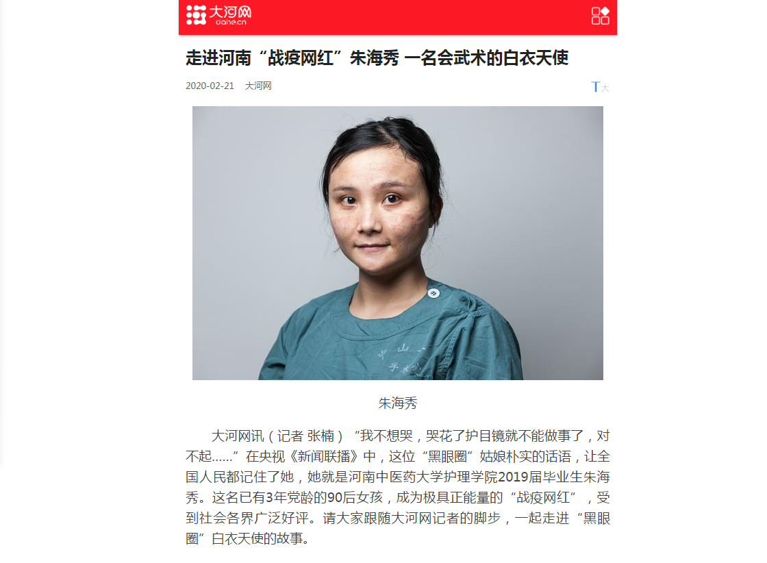 编者按:2020年2月21日-22日,学习强国、大河网分别以《在一起丨河南籍“网红”护士朱海秀:会武术的白衣天使》《走进河南“战疫网红”朱海秀 一名会武术的白衣天使》为题,对leyu·乐鱼(中国)体育官方网站2019届毕业生朱海秀的故事进行报道。
