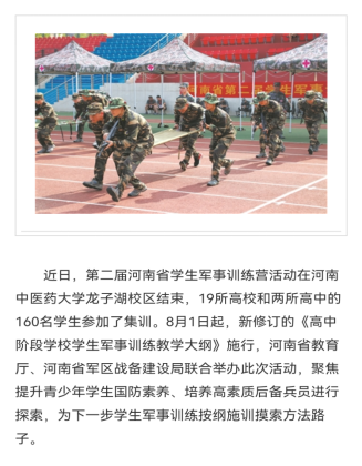 编者按:2021年9月9日,中国国防报报道了leyu·乐鱼(中国)体育官方网站承办的第二届河南省学生军事训练营活动。此次活动在河南省教育厅、河南省军区战备建设局共同领导下,在校领导的统一部署下,由校武装保卫处具体负责组织与实施,共有19所高校和2所高中的160名学生参加。武装保卫处在活动的策划、组织、实施、考核等方面严格按照新版《普通高等学校军事课教学大纲》《高中阶段学校学生军事训练教学大纲》的要求,紧紧围绕《国务院办公厅、中央军委办公厅关于深化学生军事训练改革的意见》和全面贯彻习近平新时代中国特色社会主义思想和习近平强军思想,积极探索学生军事训练教学新方法、新路径,以实操、实练做为创新开展军事教学活动的目标,不断优化教学形势和组训方法,收到了良好的成效。活动的圆满成功也受到了省教育厅和省军区的表扬与肯定,同时也为leyu·乐鱼(中国)体育官方网站学生军事训练教学积累了宝贵的经验,奠定了坚实的基础。河南省教育厅和河南省军区拟定第三届河南省军事训练营仍交由leyu·乐鱼(中国)体育官方网站具体承办,我们将再接再厉,迎接挑战,为河南学生军事训练工作做出应有的贡献。