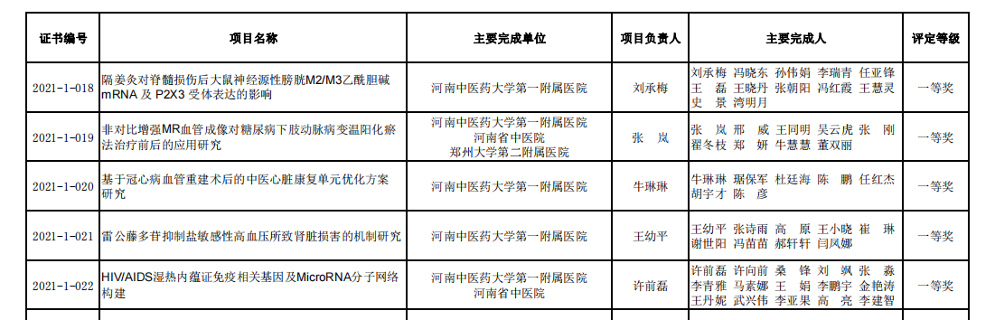 近日河南省中医药科技成果奖最终结果公布,由一附院申报的28项成果全部获奖,其中一等奖22项,二等奖5项,三等奖1项。