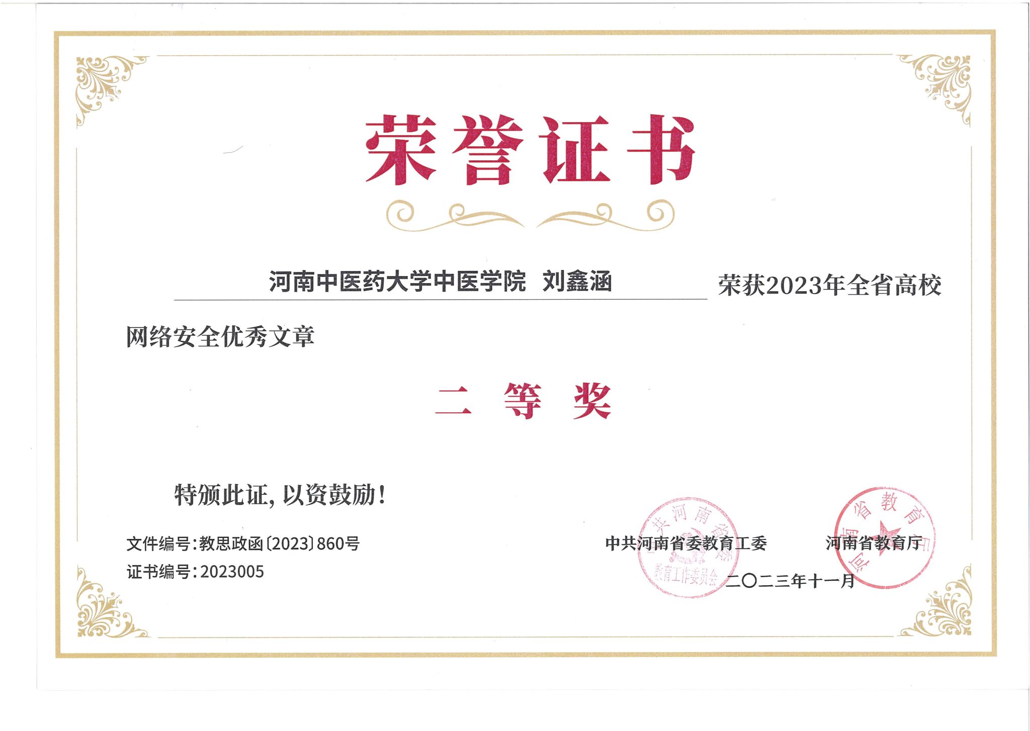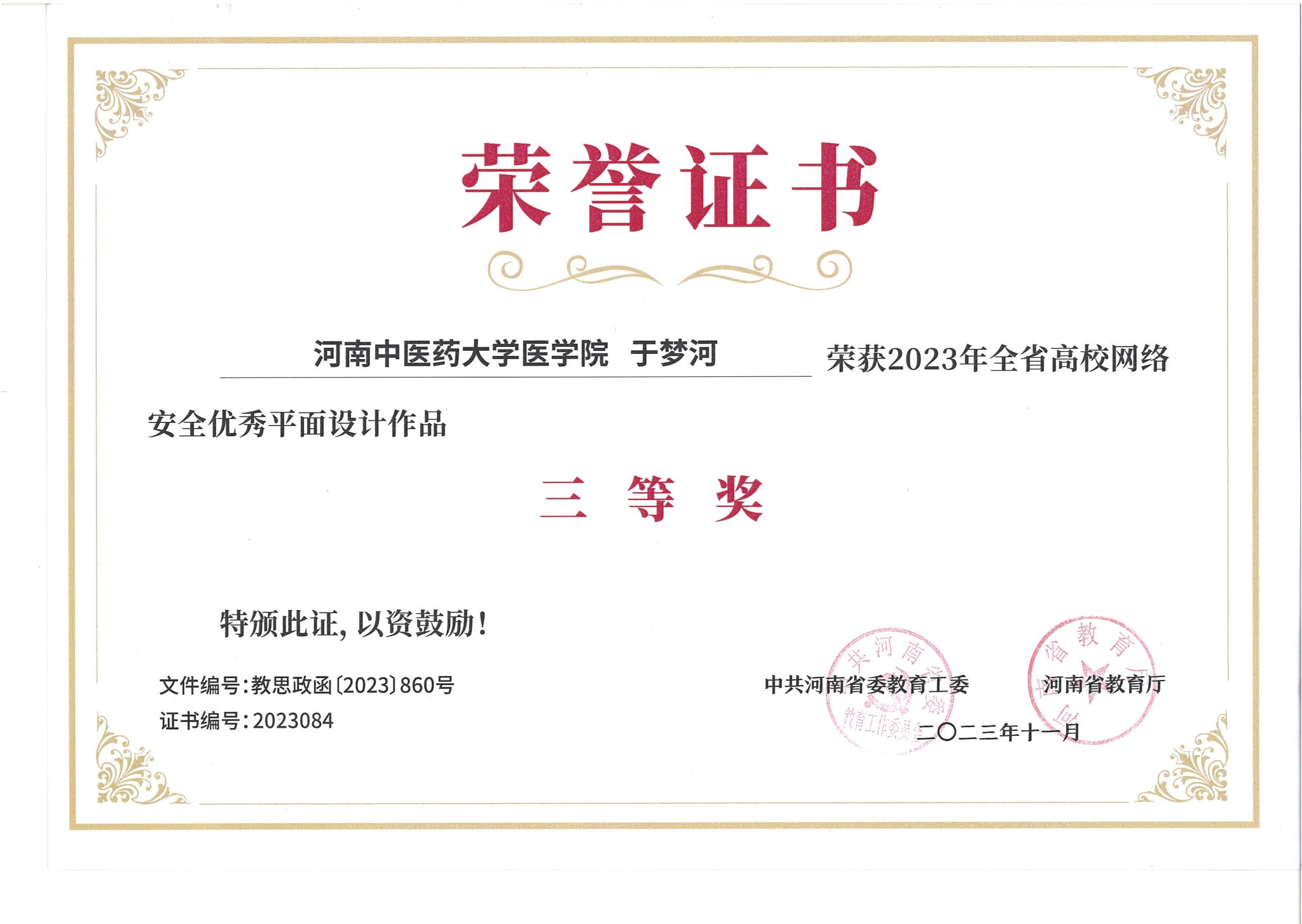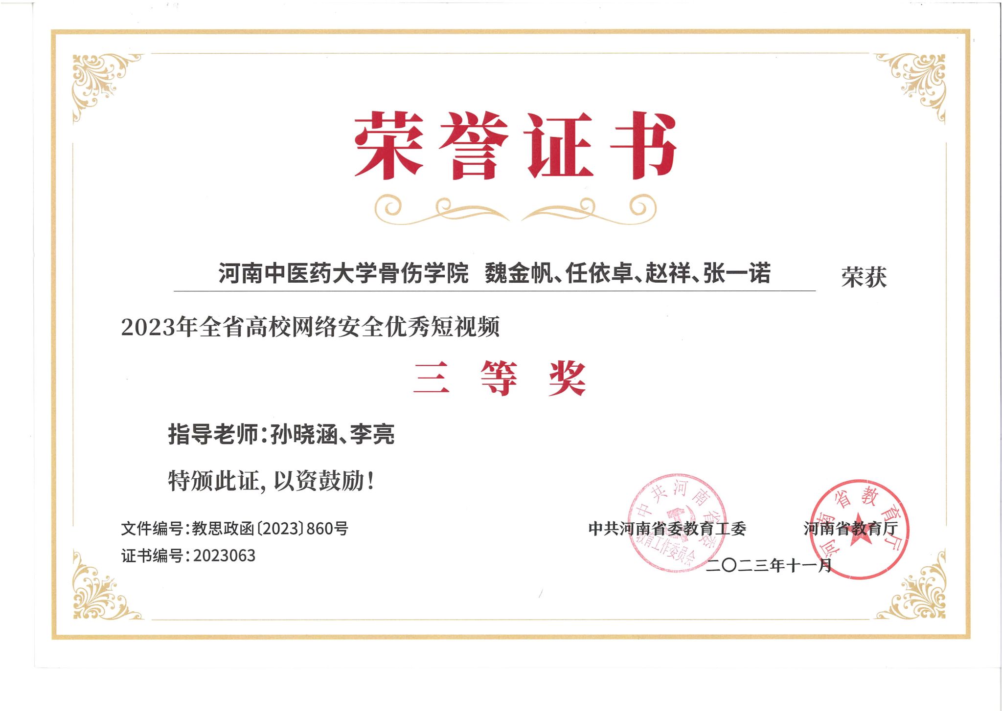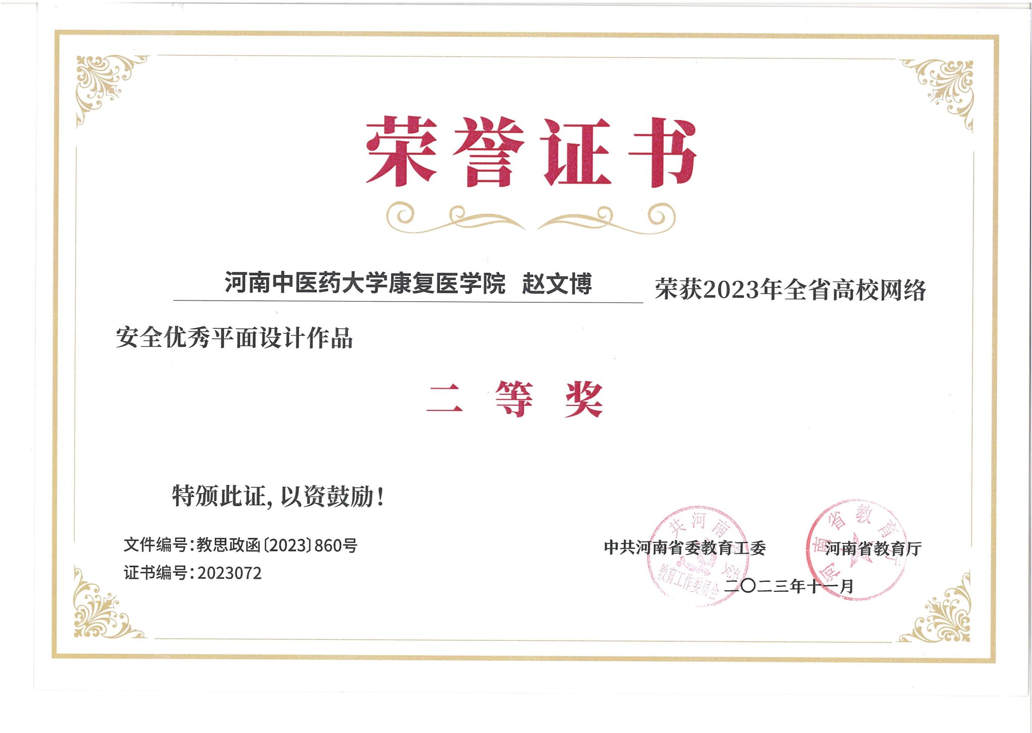 中医学院刘鑫涵同学的《人人守护一丝线,自可织成安全网》荣获优秀文章作品二等奖;康复医学院赵文博同学的《网络安全宣传》荣获优秀平面设计作品二等奖;骨伤学院魏金帆、任依卓、赵祥、张一诺等4名同学创作,孙晓涵、李亮等2名老师指导的《手网·守网》荣获优秀短视频作品三等奖;医学院于梦河同学的《国家网络安全》荣获优秀平面设计作品三等奖。
