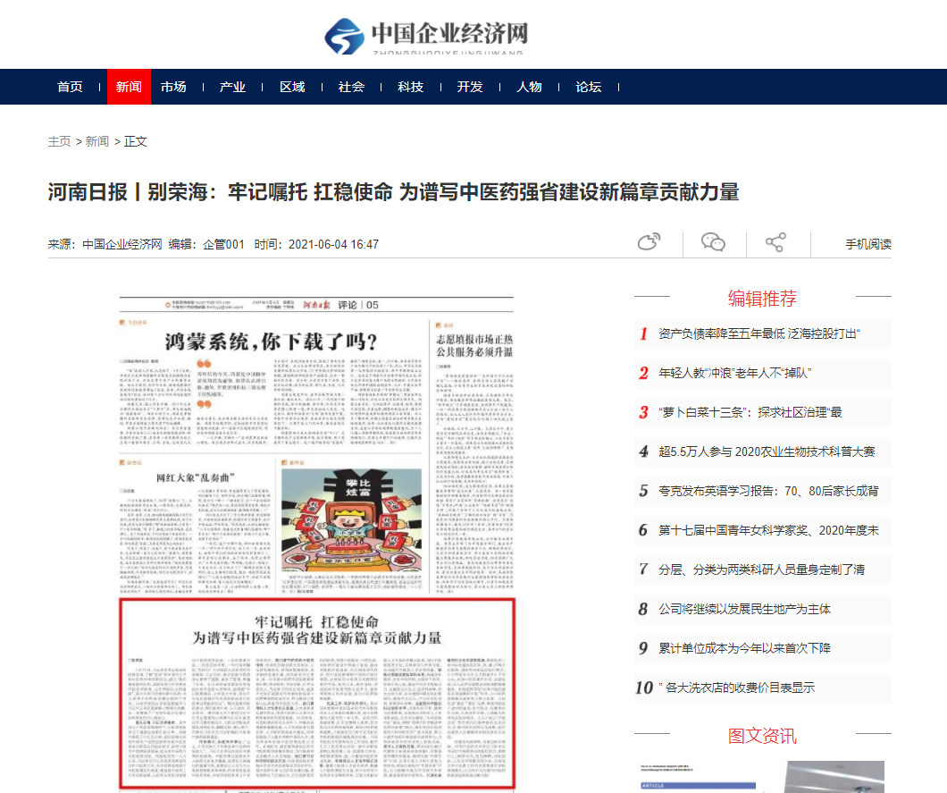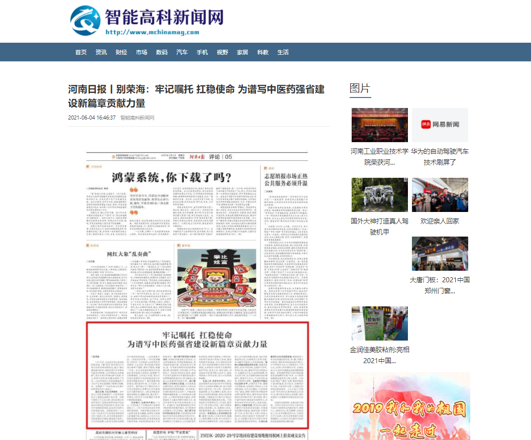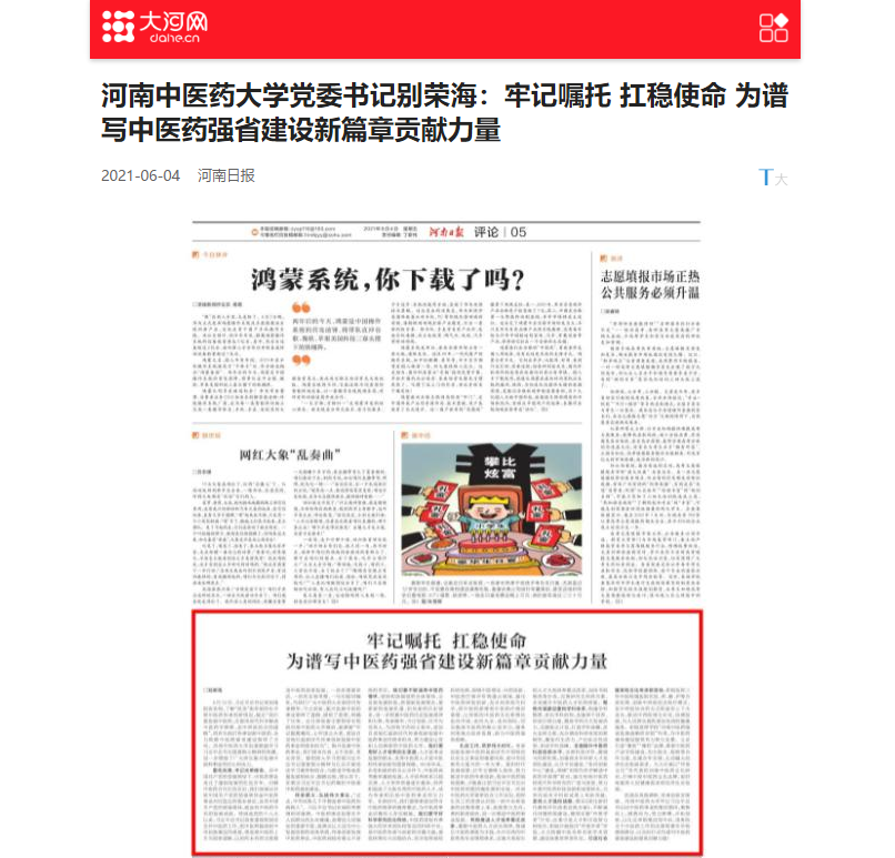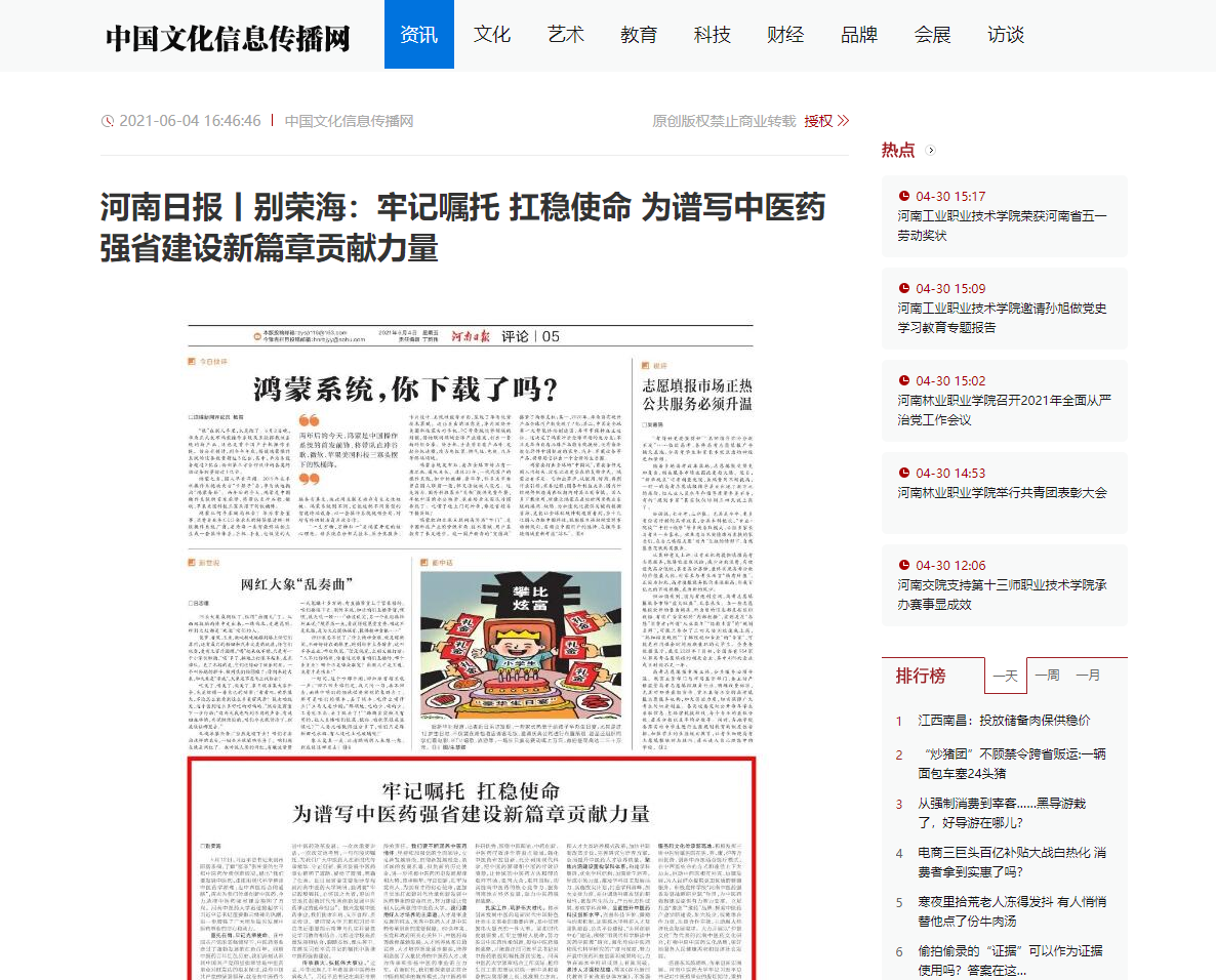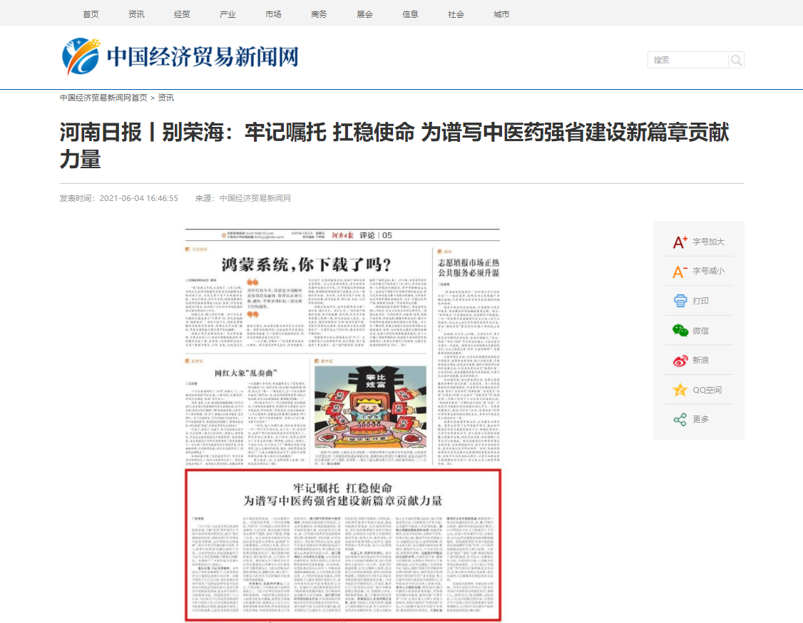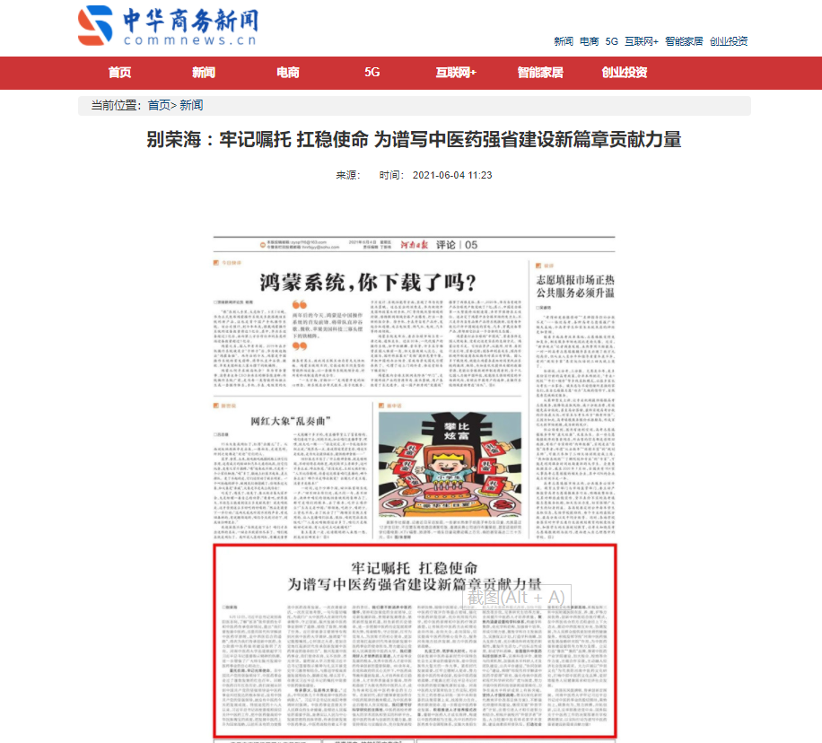 编者按:2021年6月4日-6日,人民网、新华社客户端、中国教育网、中国医药新闻网、中国医学新闻网、中国文化信息传播网、中国经济贸易新闻网、中国资源新闻网、中科信息创新网、中国产业新闻网、中国企业经济网、中华教育资讯、中华商务新闻、中国头条新闻网、中华新闻社、中国质量在线、大河网、河南教育、河南高校资讯网、法制社会网、新闻100度、燕赵新闻网、智能高科新闻网、旅游中国网、东方新闻、中原资讯网、华西教育网、中商网等数十家媒体刊发了leyu·乐鱼(中国)体育官方网站党委书记别荣海的理论文章《牢记嘱托 扛稳使命 为谱写中医药强省建设新篇章贡献力量》。