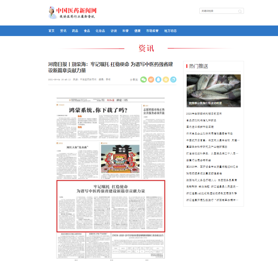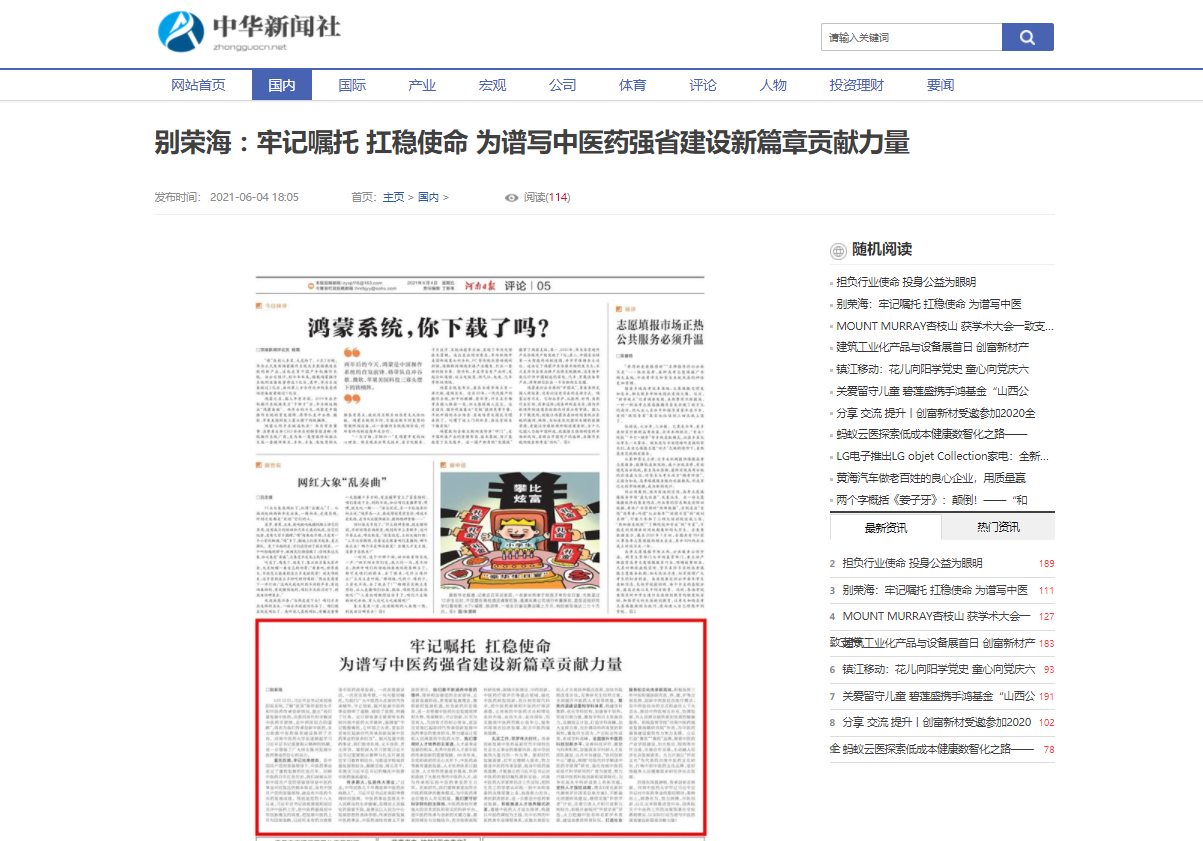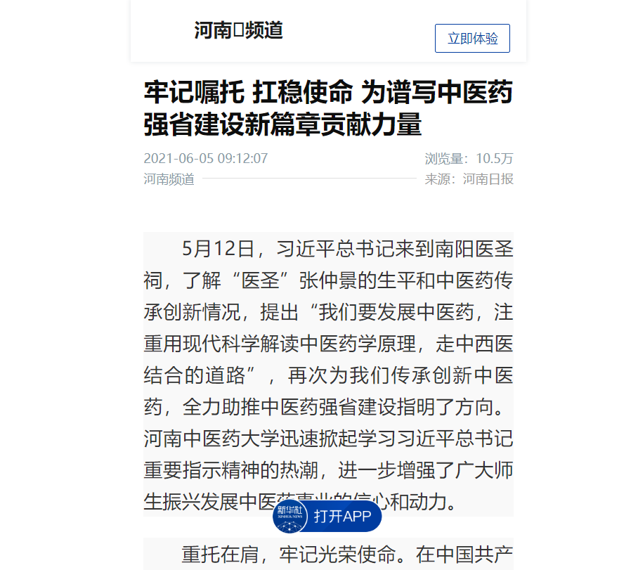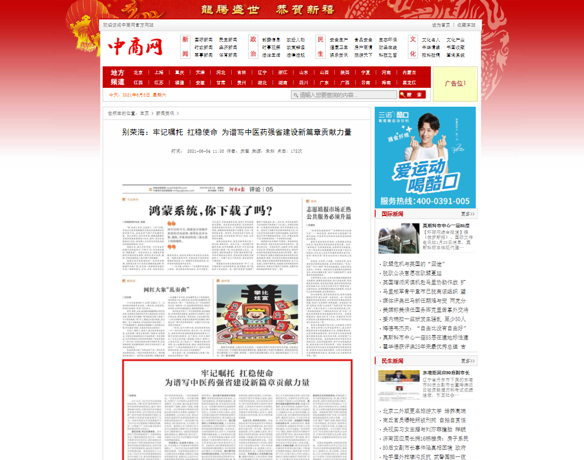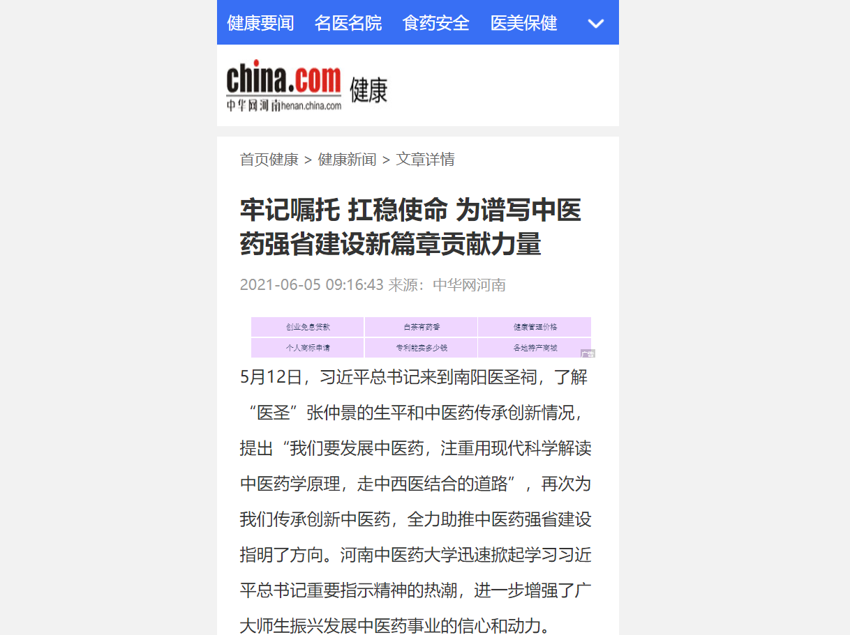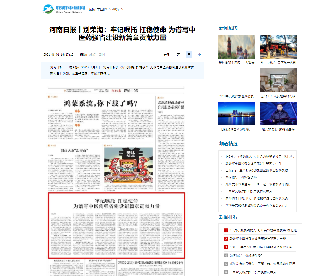 编者按:2021年6月4日-6日,人民网、新华社客户端、中国教育网、中国医药新闻网、中国医学新闻网、中国文化信息传播网、中国经济贸易新闻网、中国资源新闻网、中科信息创新网、中国产业新闻网、中国企业经济网、中华教育资讯、中华商务新闻、中国头条新闻网、中华新闻社、中国质量在线、大河网、河南教育、河南高校资讯网、法制社会网、新闻100度、燕赵新闻网、智能高科新闻网、旅游中国网、东方新闻、中原资讯网、华西教育网、中商网等数十家媒体刊发了leyu·乐鱼(中国)体育官方网站党委书记别荣海的理论文章《牢记嘱托 扛稳使命 为谱写中医药强省建设新篇章贡献力量》。