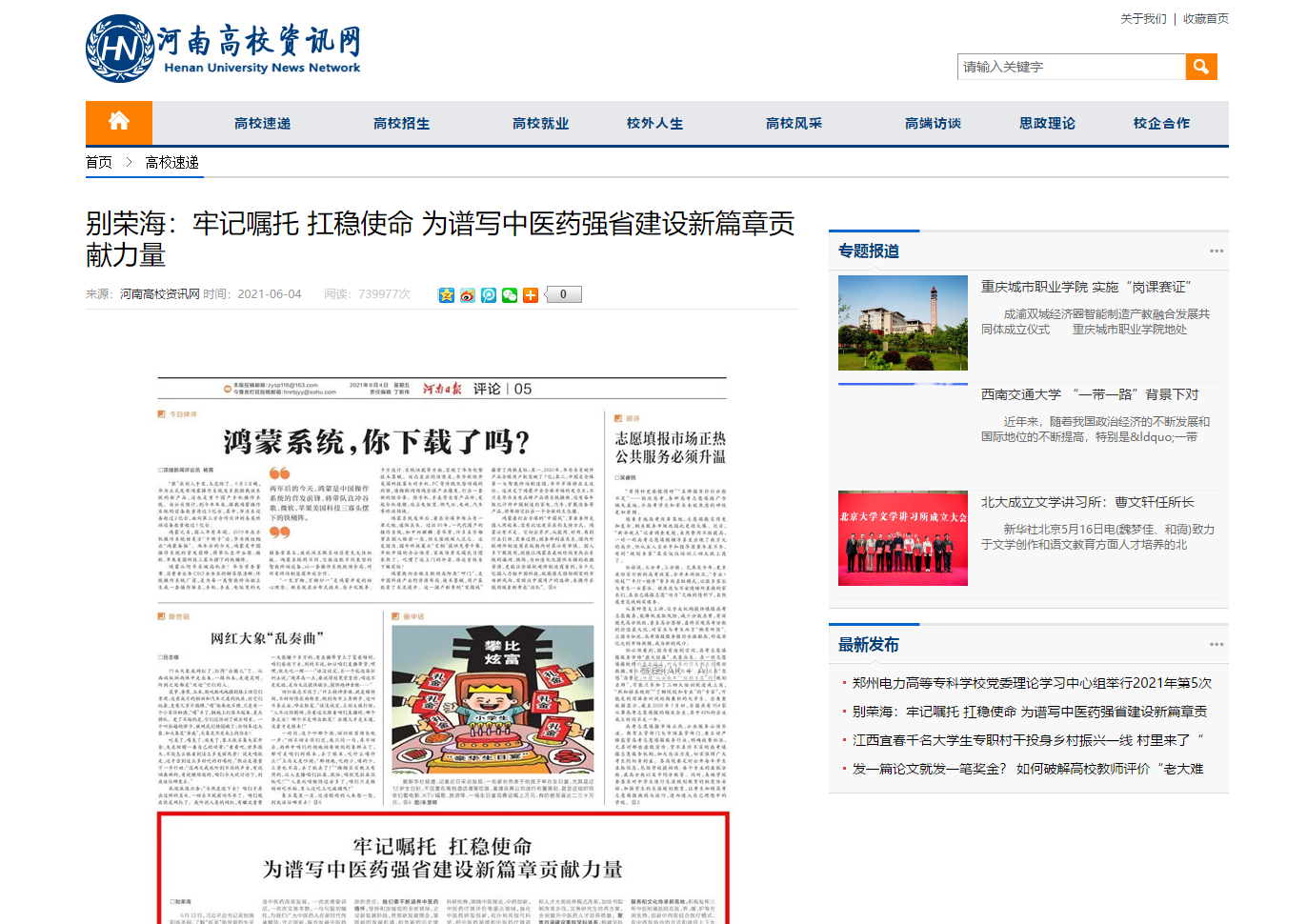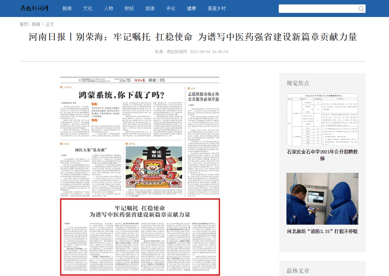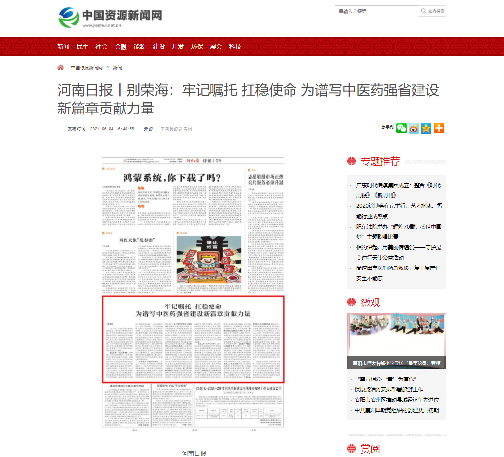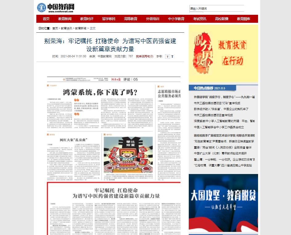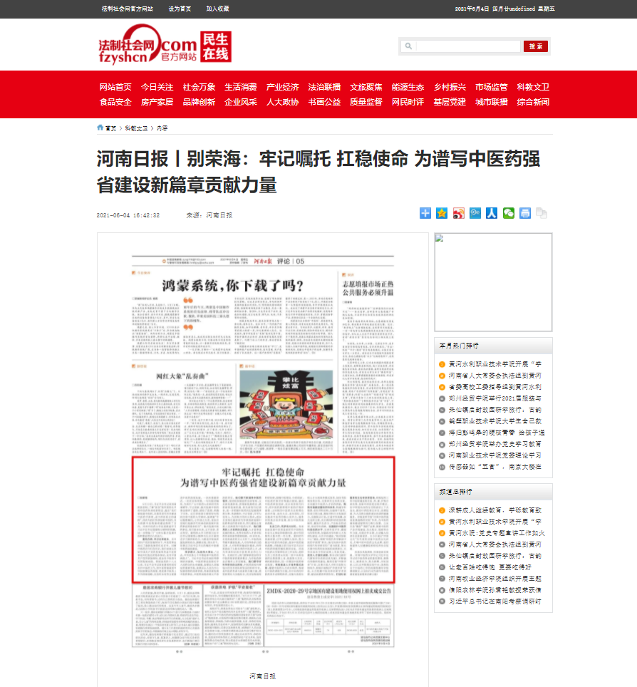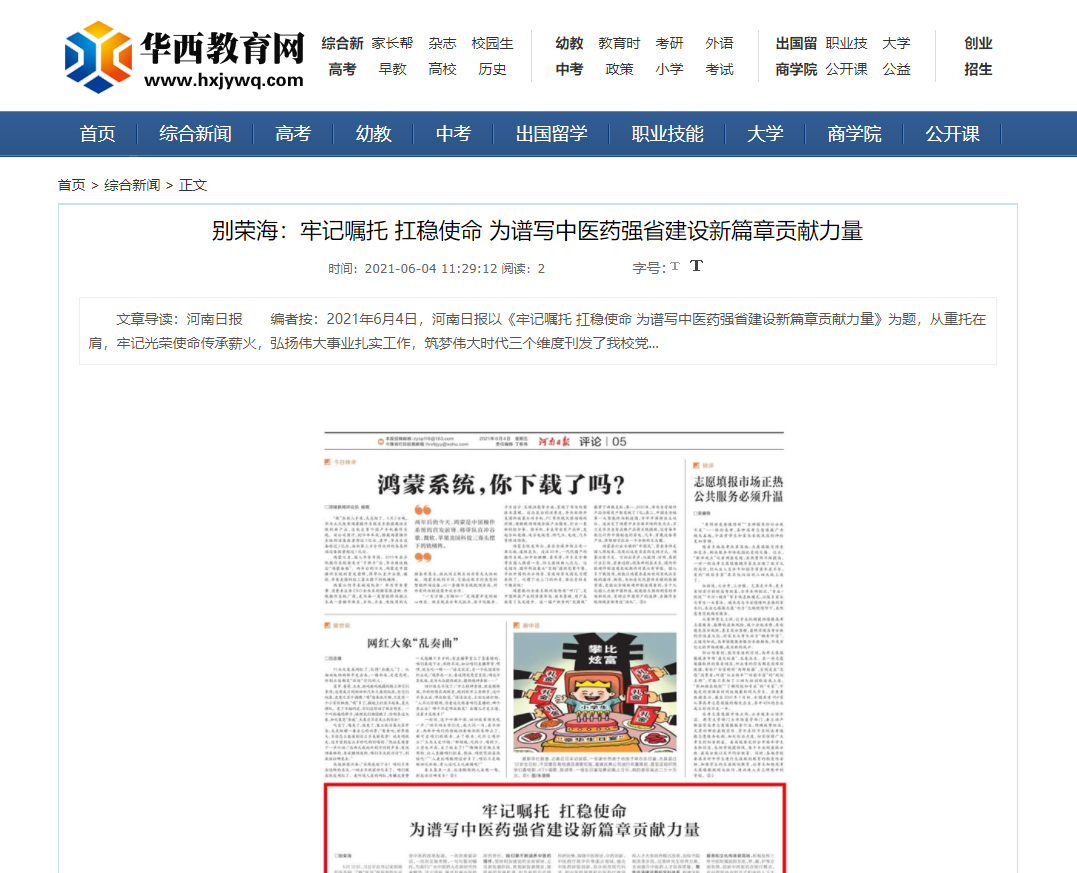 编者按:2021年6月4日-6日,人民网、新华社客户端、中国教育网、中国医药新闻网、中国医学新闻网、中国文化信息传播网、中国经济贸易新闻网、中国资源新闻网、中科信息创新网、中国产业新闻网、中国企业经济网、中华教育资讯、中华商务新闻、中国头条新闻网、中华新闻社、中国质量在线、大河网、河南教育、河南高校资讯网、法制社会网、新闻100度、燕赵新闻网、智能高科新闻网、旅游中国网、东方新闻、中原资讯网、华西教育网、中商网等数十家媒体刊发了leyu·乐鱼(中国)体育官方网站党委书记别荣海的理论文章《牢记嘱托 扛稳使命 为谱写中医药强省建设新篇章贡献力量》。