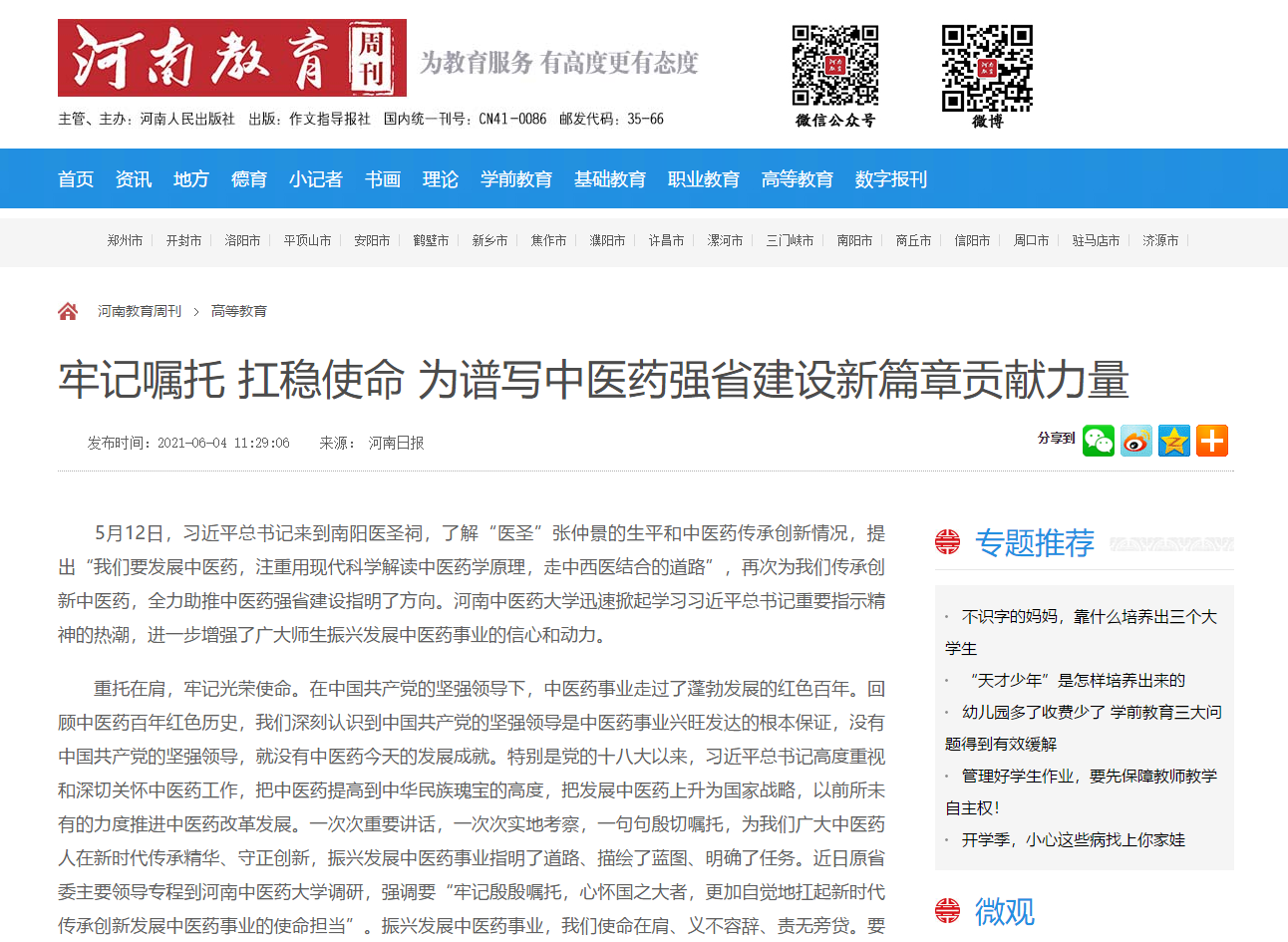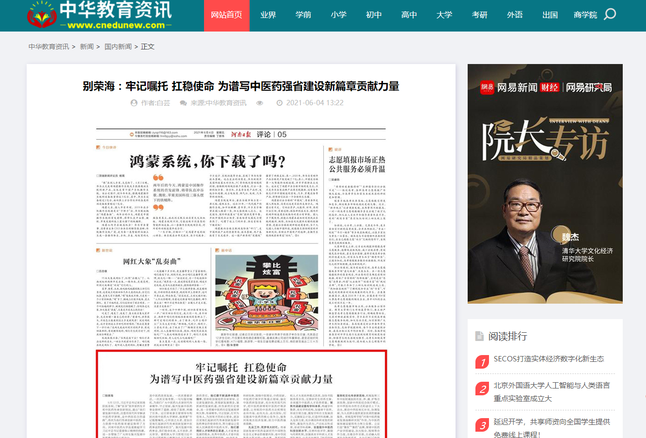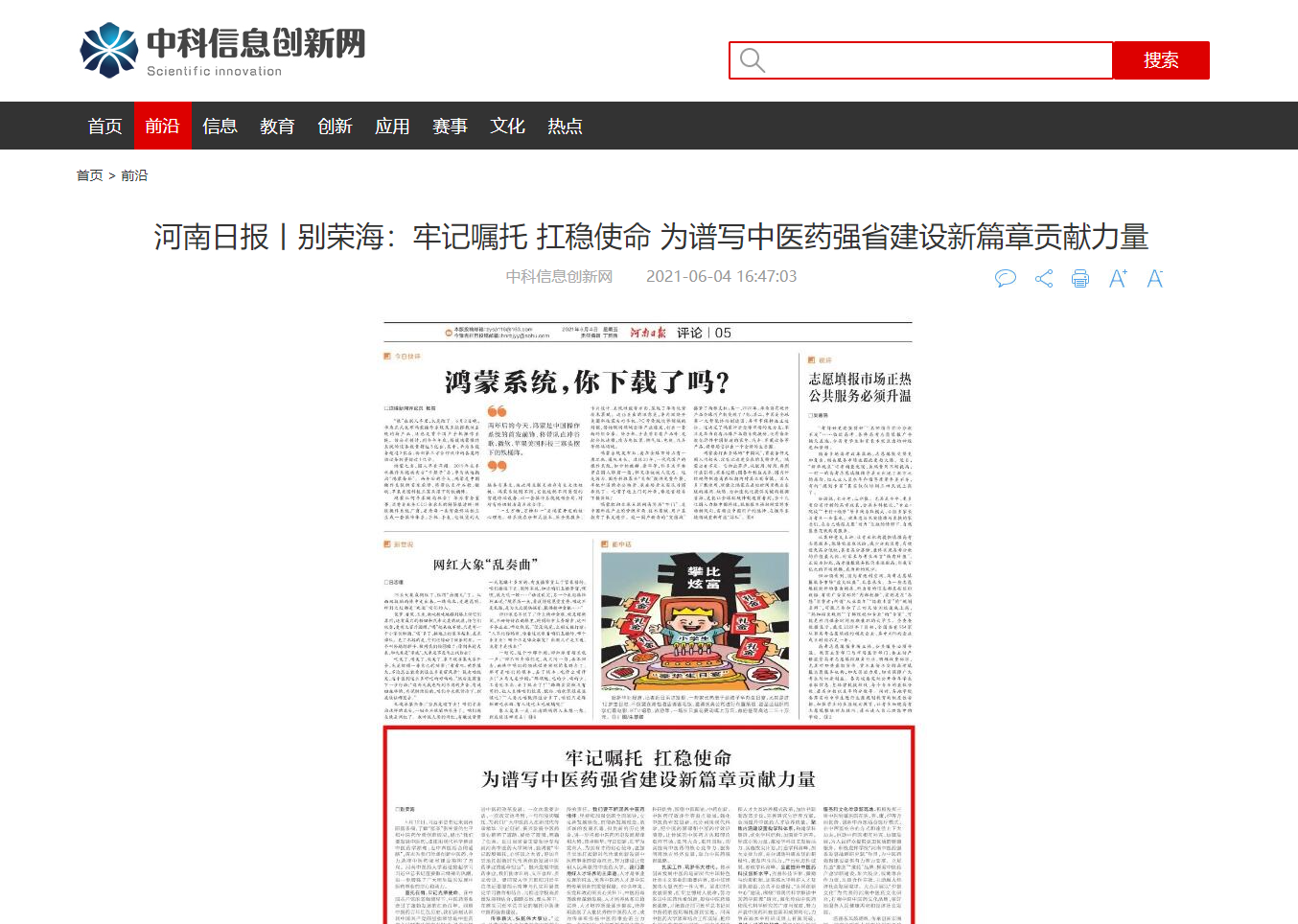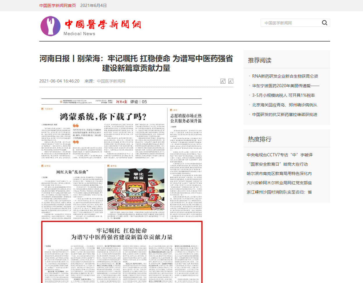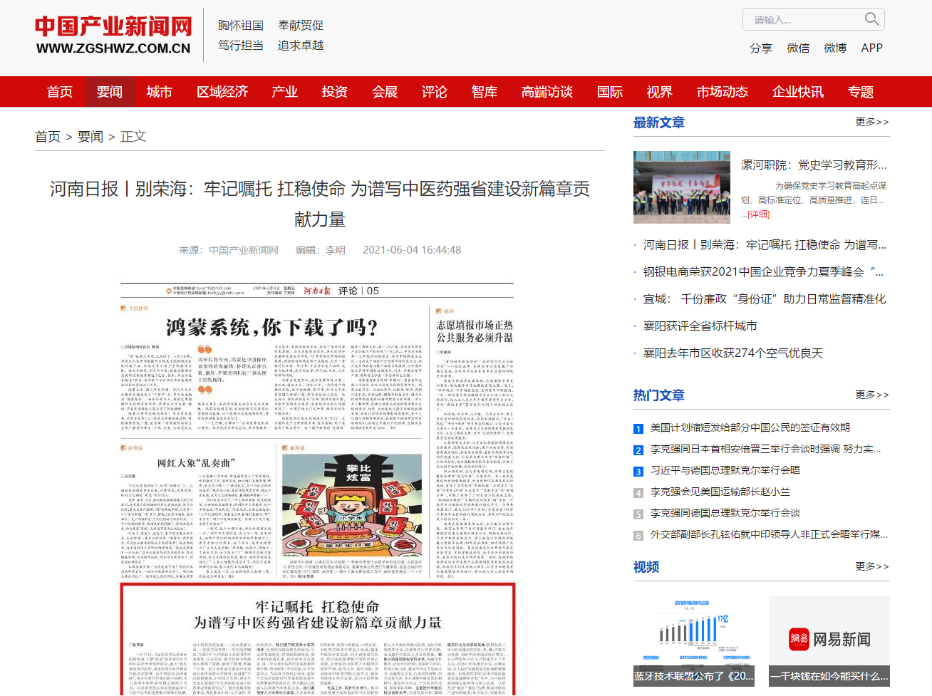 编者按:2021年6月4日-6日,人民网、新华社客户端、中国教育网、中国医药新闻网、中国医学新闻网、中国文化信息传播网、中国经济贸易新闻网、中国资源新闻网、中科信息创新网、中国产业新闻网、中国企业经济网、中华教育资讯、中华商务新闻、中国头条新闻网、中华新闻社、中国质量在线、大河网、河南教育、河南高校资讯网、法制社会网、新闻100度、燕赵新闻网、智能高科新闻网、旅游中国网、东方新闻、中原资讯网、华西教育网、中商网等数十家媒体刊发了leyu·乐鱼(中国)体育官方网站党委书记别荣海的理论文章《牢记嘱托 扛稳使命 为谱写中医药强省建设新篇章贡献力量》。