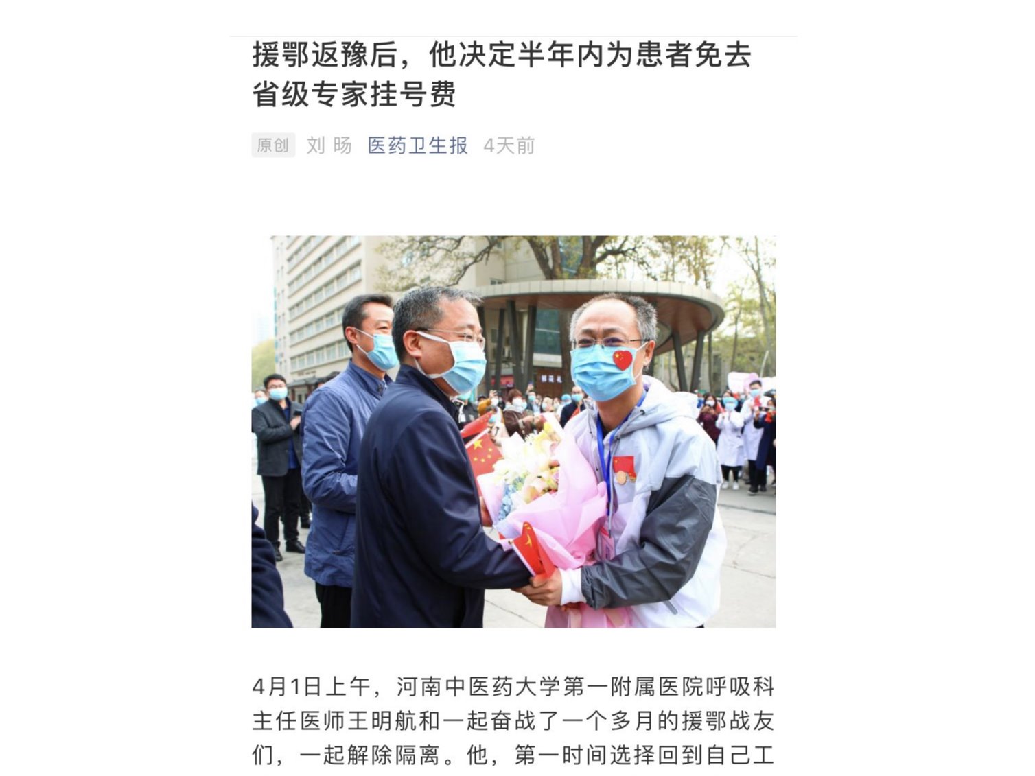 编者按:近日,医药卫生报、民生大参考对leyu·乐鱼(中国)体育官方网站一附院呼吸科副主任王明航援鄂返豫后决定半年内为患者免去省级专家挂号费,回馈家乡人民进行报道。现将医药卫生报全文刊发如下: