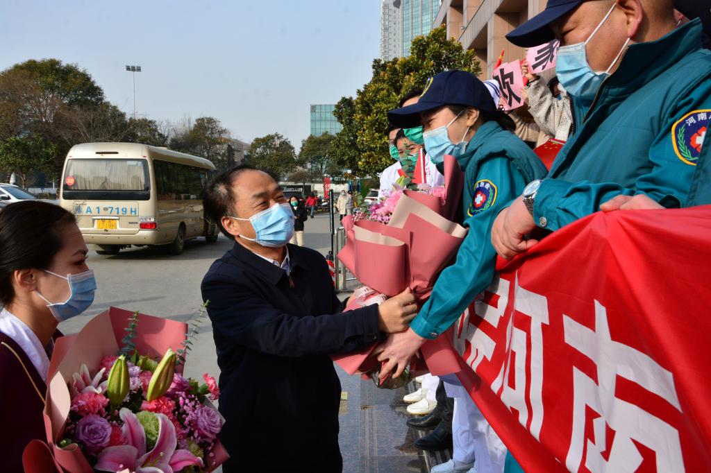 仪式上,院长张大伟对援冀医疗队的胜利归来表示欢迎,院领导为援冀医疗队献上鲜花并表示祝贺。党委书记周运峰对队员们圆满完成援冀转运任务表示感谢,他深情地表示,援冀医疗队员们辛苦了,面对河北疫情,我们的队员勇于担当,舍小家为大家,圆满完成了医疗转运任务,以实际行动诠释了生命至上、举国同心、舍生忘死、尊重科学、命运与共的伟大抗疫精神,希望全院教职工生以他们为榜样,弘扬伟大的抗疫精神,凝聚推动医院高质量发展的强大动力,他叮嘱援冀医疗队员们养足精气神,为医院发展再立新功。新春佳节将至,周运峰代表医院党委向大家送上新春祝福,祝愿大家身体健康,工作顺利!