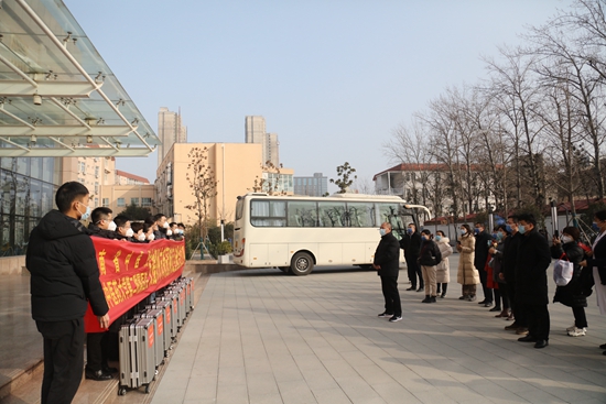 本网讯(文图/王伟琰)2021年1月13日,二附院再次集结一支8人的新冠肺炎中医救治医疗队,赶赴郑州市新冠肺炎医疗救治定点医院开展医疗救治工作,二附院在2号住院部楼前举行出征仪式,院党委书记王海亮及相关科室负责人等参加。
