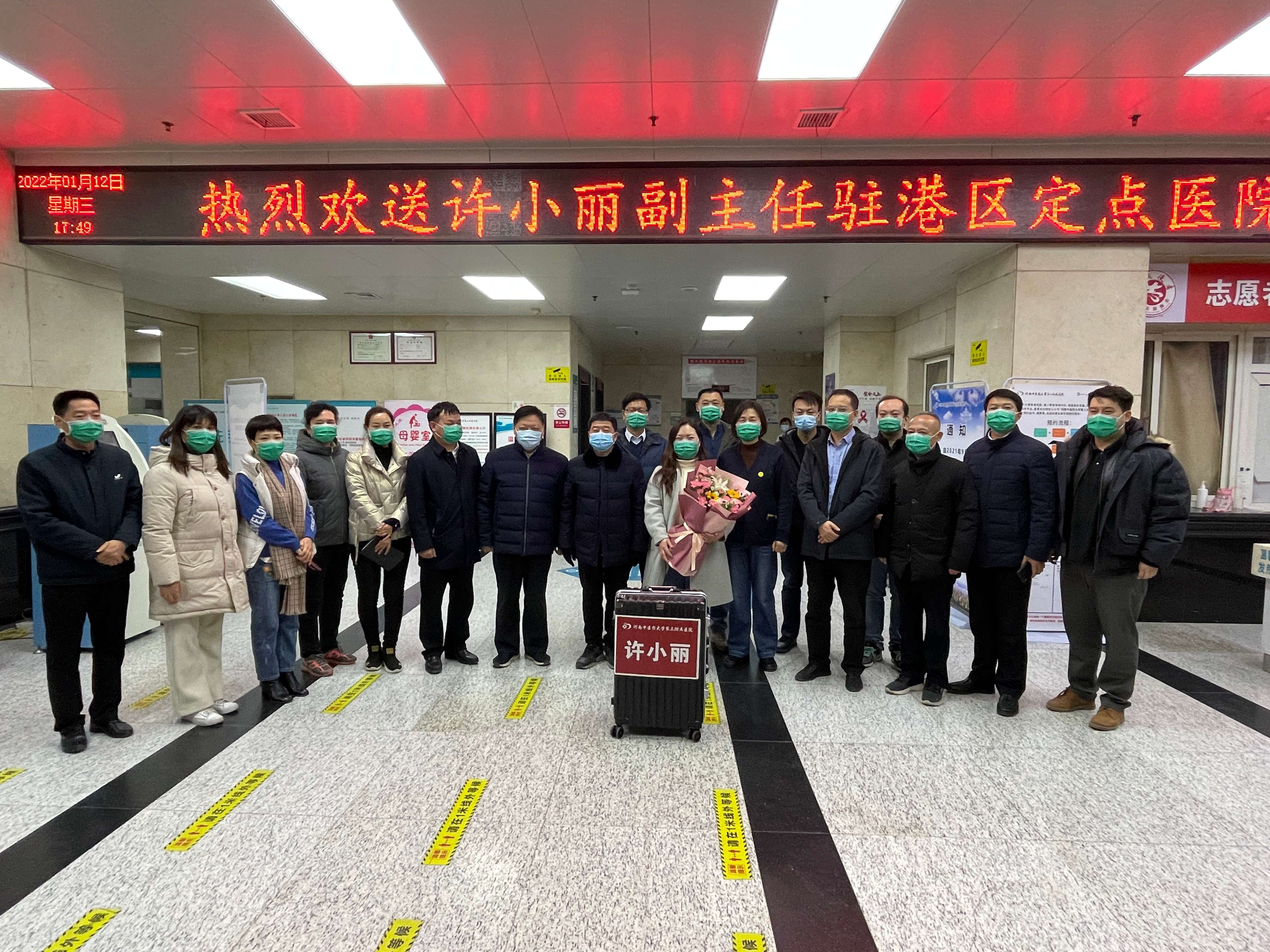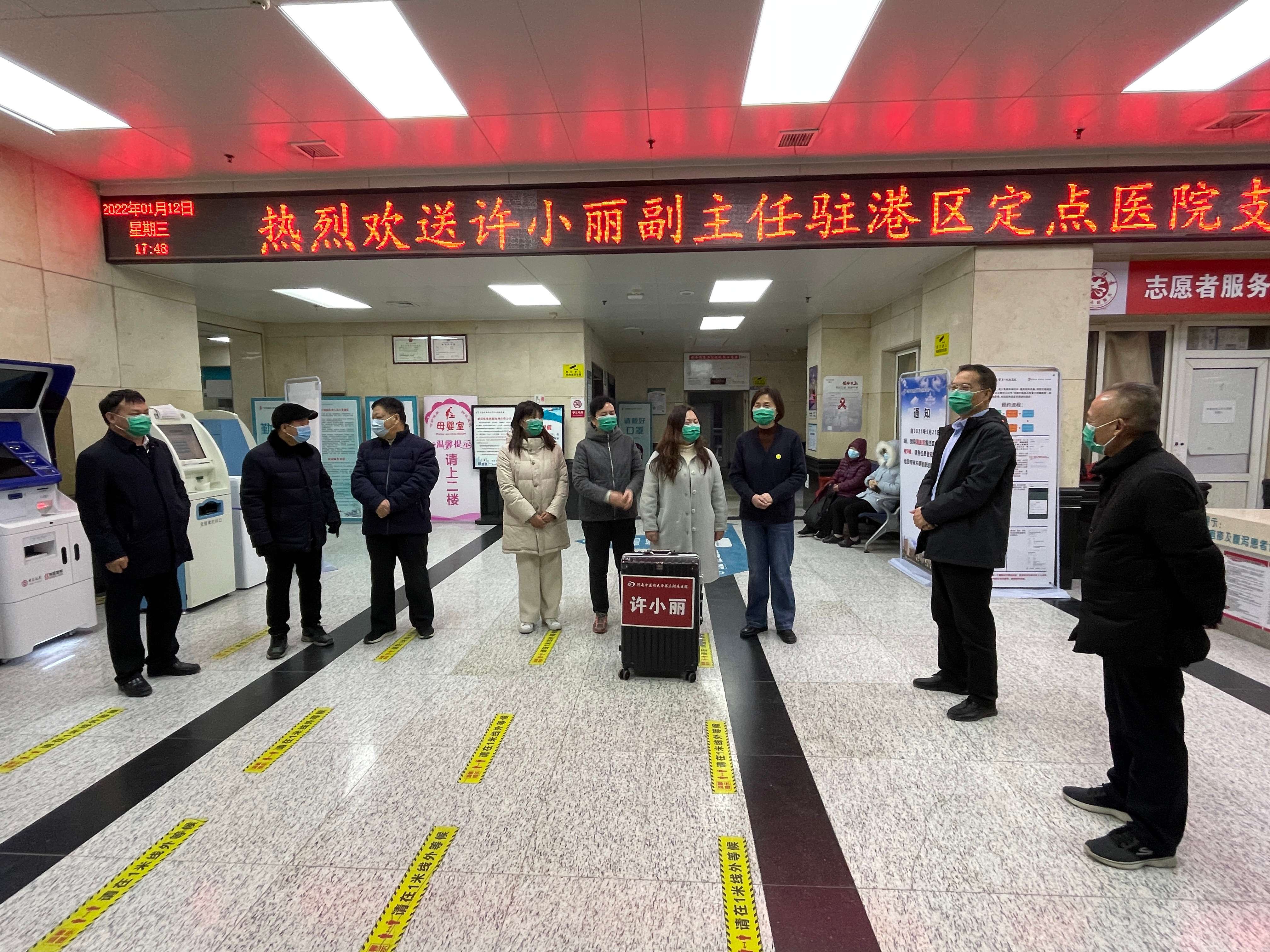 本网讯(文图/潘向昆)2022年1月12日下午,三附院第四批专家感染管理科副主任许小丽医师进驻港区定点医院支援抗疫。医院副院长张进一、纪委书记刘会勋,医院党委委员、副院长王志超、高翔,医院党委委员、工会主席蔡庆春出席欢送仪式,感染管理科和相关职能科室负责人等参加。