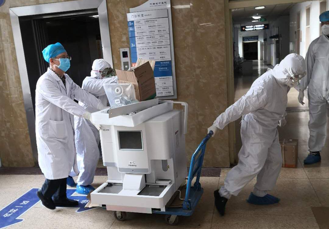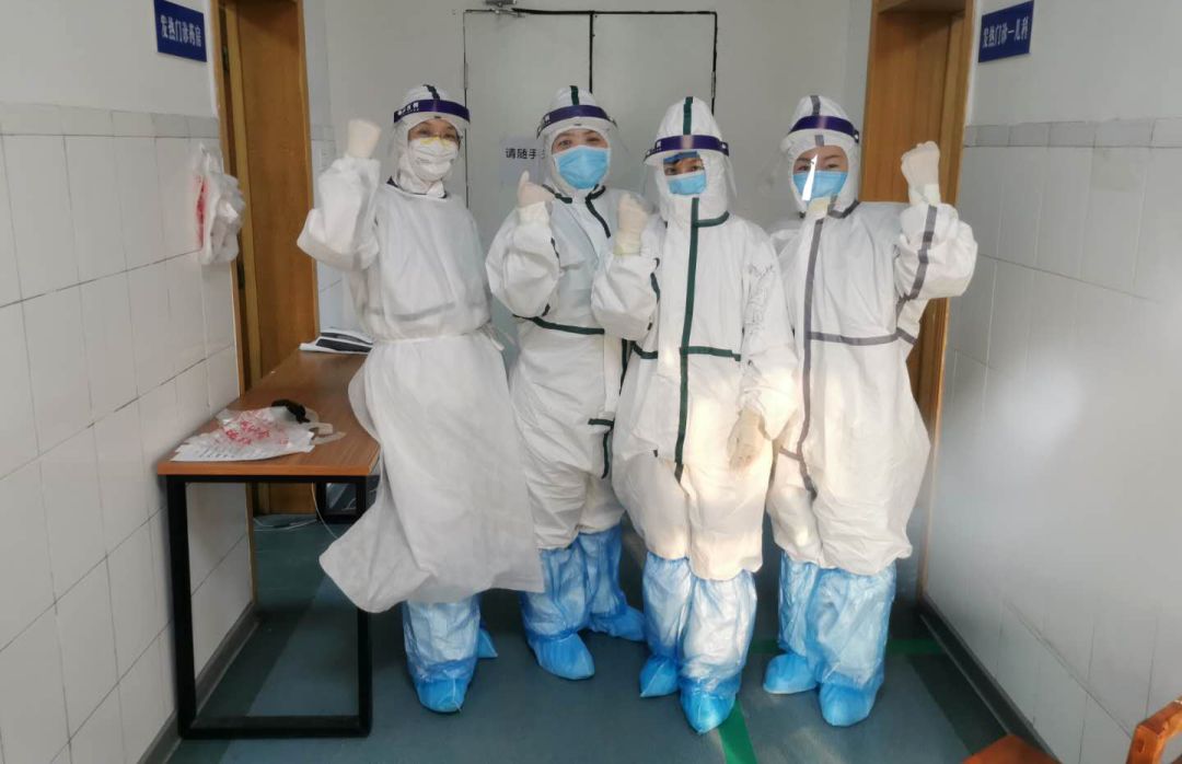 为了减少交叉感染,医院成立发热门诊检验室。接到入驻发热门诊的通知后,检验中心全科人员纷纷报名参战,刘心伟、曹新春、李辉做为第一批工作人员首先入驻发热门诊封闭工作,付宗强、路娜、李艳娟做为第二批人员入驻。第一批入驻的是三名党员,在这个特殊时期,三名党员冲在了最前面,刘心伟和曹新春家里都有两个年幼的小孩,他们把年幼的孩子托付给家人后就义无反顾的来到发热门诊工作。第二批工作人员中付宗强家人都不在身边,自己肩负起了工作和生活的全部重担。更要说明的是,其中路娜和李艳娟是两名女同志,此刻她们巾帼不让须眉,依然勇敢的站在了战斗的最前线,在这里,她们穿上了防护服、隔离衣,戴上N95口罩、护目镜,防护面屏,双层乳胶手套,鞋套和靴套,穿上这套装备后,为了节省防护物资,工作人员要在6到8个小时内不喝水不吃饭不上厕所,每次下班后里面的衣服全部都湿透了,脸压变形了,手上捂出了成片的红斑,大家都咬牙坚持着。