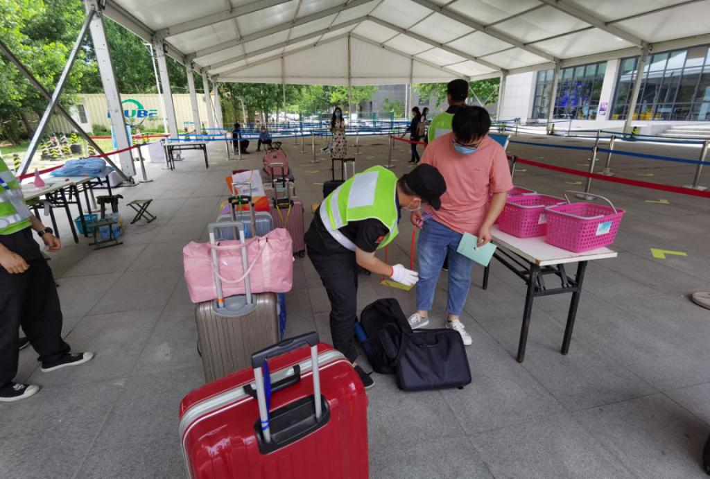 安保人员对返校学生及行李进行消毒