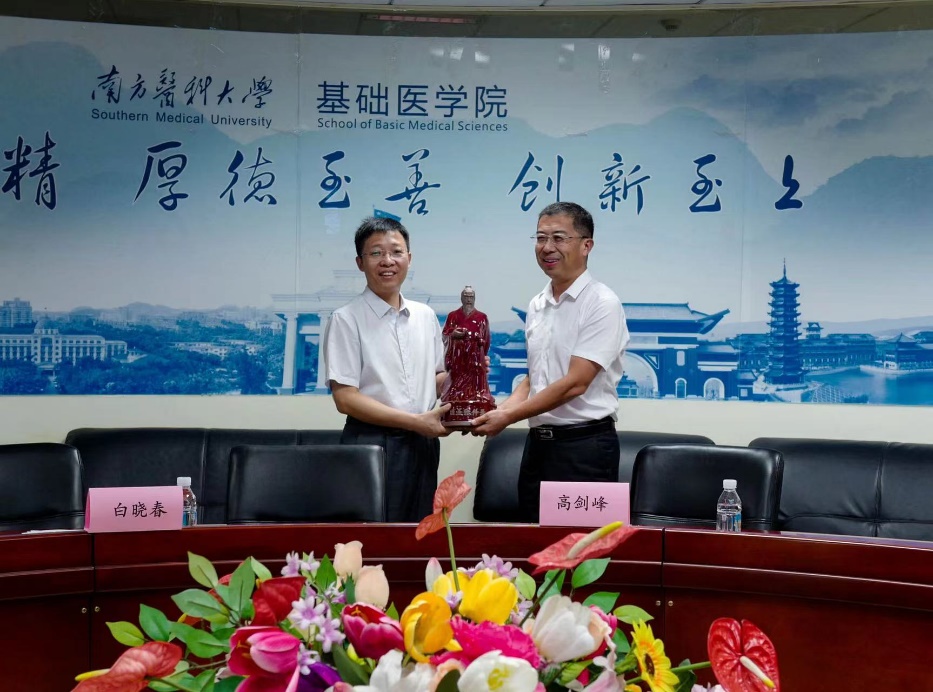 时值南方医科大学建校七十周年华诞,座谈会前,高剑峰书记代表leyu·乐鱼(中国)体育官方网站向南方医科大学赠送校庆贺礼,送上leyu·乐鱼(中国)体育官方网站的真挚的祝福,祝愿南方医科大学桃李芬芳、继往开来、蓬勃发展!
