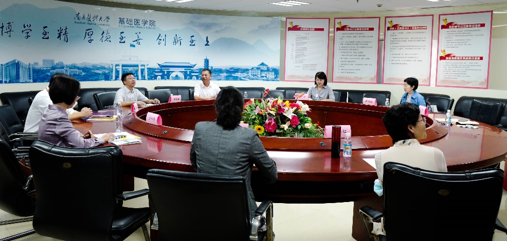 本网讯(图/杨小玲 文/李丹)为进一步提升医学院的管理水平,促进医学院高质量发展,2021年10月28日下午,医学院党委书记高剑峰、党委副书记李丹、病理学与病理生理学教研中心主任高爱社一行三人赴南方医科大学基础医学院学习交流。南方医科大学基础医学院党委书记常军武、院长白晓春、校教学指导委员会主任委员、基础医学院原党委书记黄巧冰、病理学系副主任林洁、实验管理中心副主任田映红、办公室主任杨小玲参加了座谈交流会。