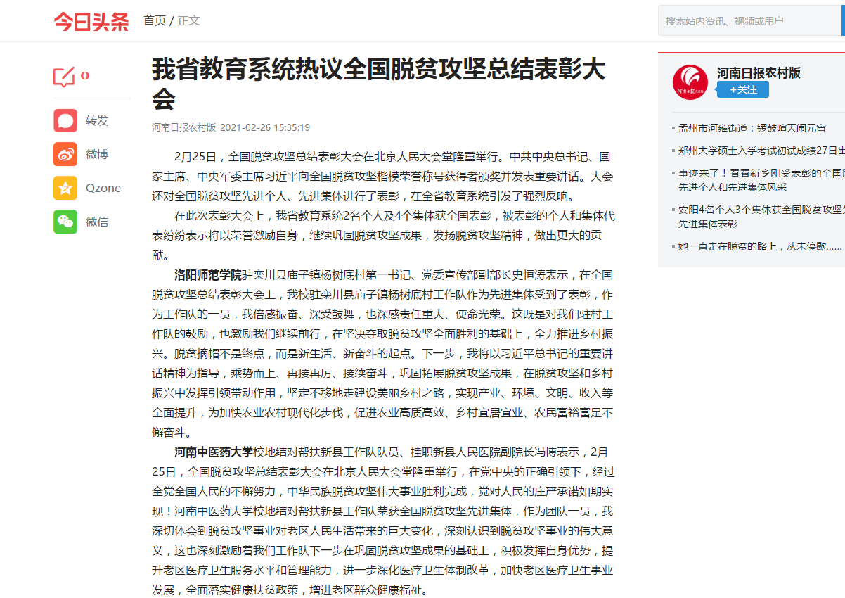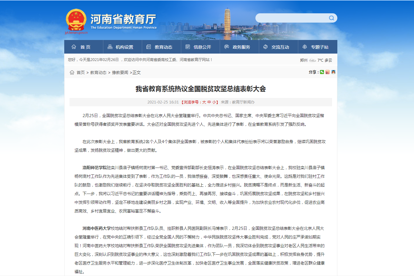 编者按:2月25日,全国脱贫攻坚总结表彰大会在北京人民大会堂隆重举行。中共中央总书记、国家主席、中央军委主席习近平向全国脱贫攻坚楷模荣誉称号获得者颁奖并发表重要讲话。大会还对全国脱贫攻坚先进个人、先进集体进行了表彰,在全省教育系统引发了强烈反响。教育厅官网、今日头条等在热议文章中刊发leyu·乐鱼(中国)体育官方网站校地结对帮扶新县工作队队员、挂职新县人民医院副院长冯博热议文章。