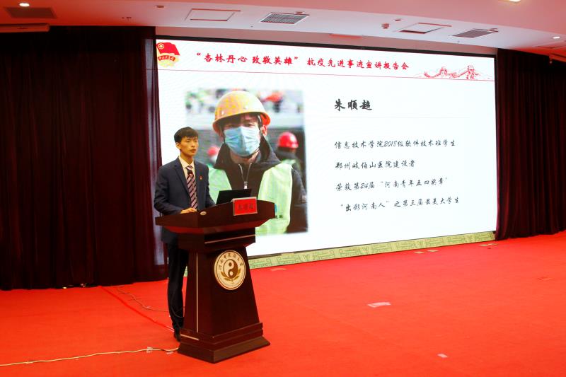 报告会上,五位宣讲团成员依次发言,与大家重温了发生在这场抗疫战争中的感人故事:二附院老年病科护师于莉一次次请战,在方舱医院中用歌声鼓舞病人战胜病魔的信念;一附院呼吸科主任医师王明航主动请缨驰援武汉,用实际行动践行了“口号喊的再多再响,都不如迎难而上”这样的铮铮誓言;武装部保卫处东明校区保卫科副科长孔祥翔家有怀孕妻子,却义无反顾守卫校园一方净土;三附院主管护师马莉,除了做好方舱医院的护理工作外,还将“常常帮助,总是安慰”赋予到真实的实践工作中;信息技术学院2020届毕业生朱顺超不顾疫情风险和家人反对,毅然报名援建河南岐伯山医院......5位宣讲团成员作为各个岗位上的先进代表,他们以自身的实际行动,生动诠释了新时代河中医人的家国情怀与赤子之心。