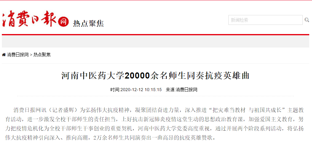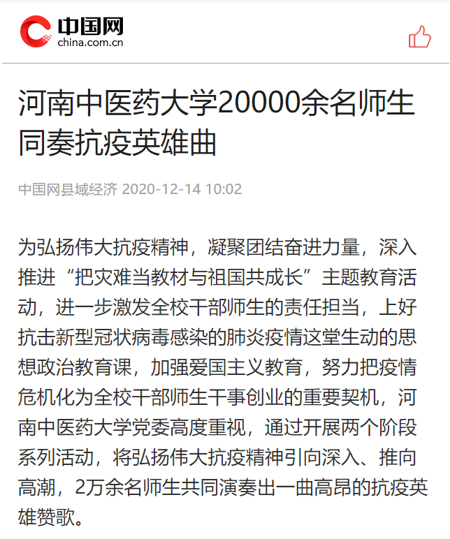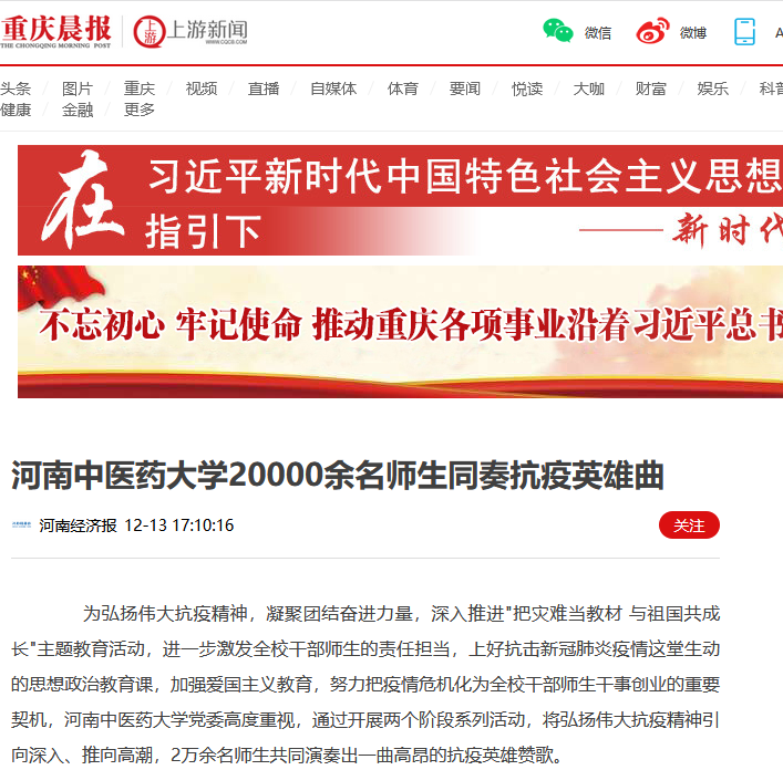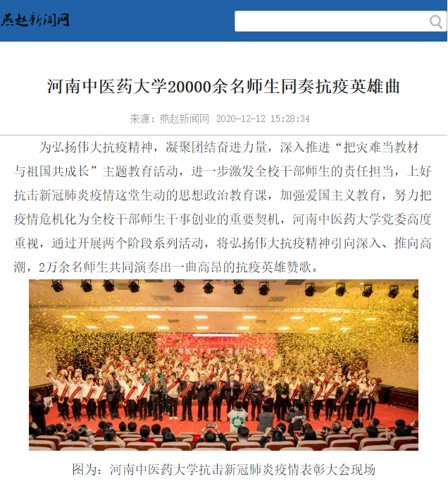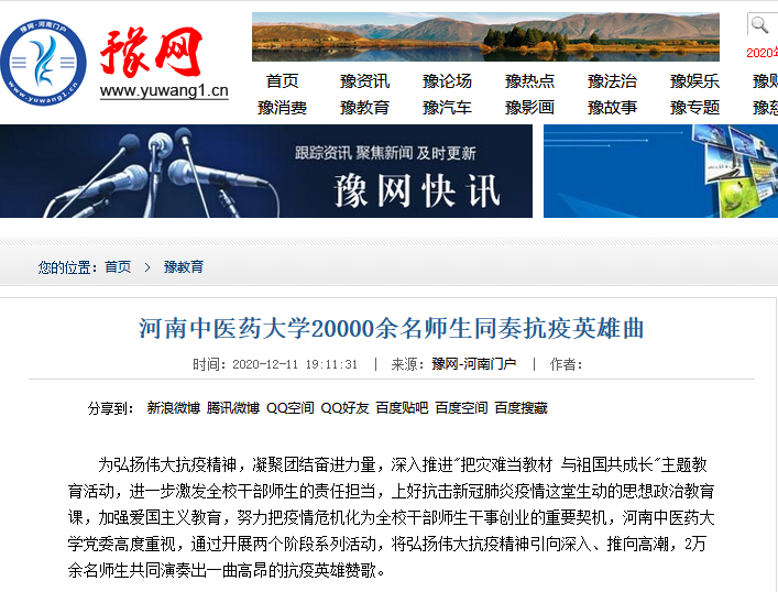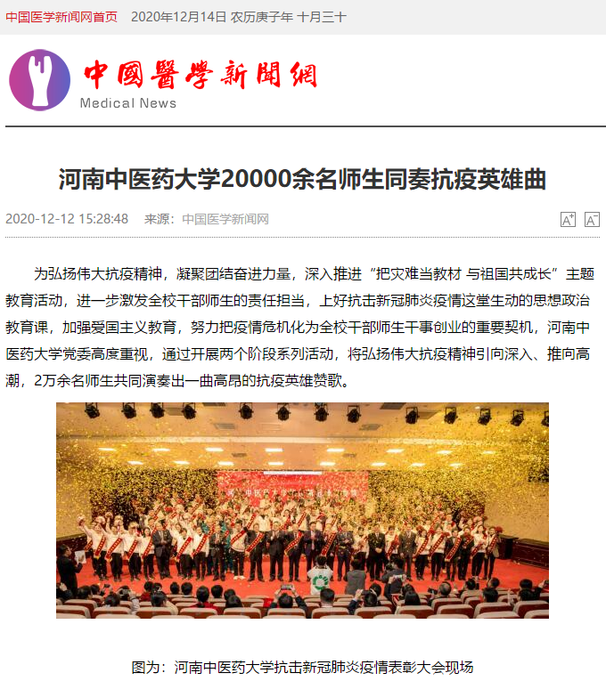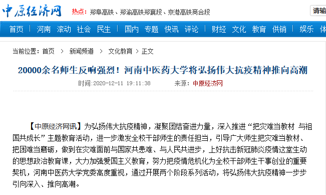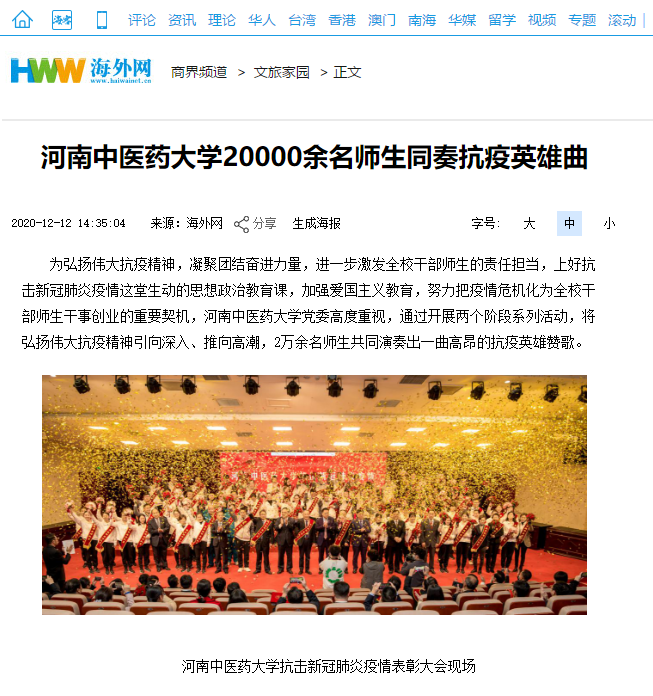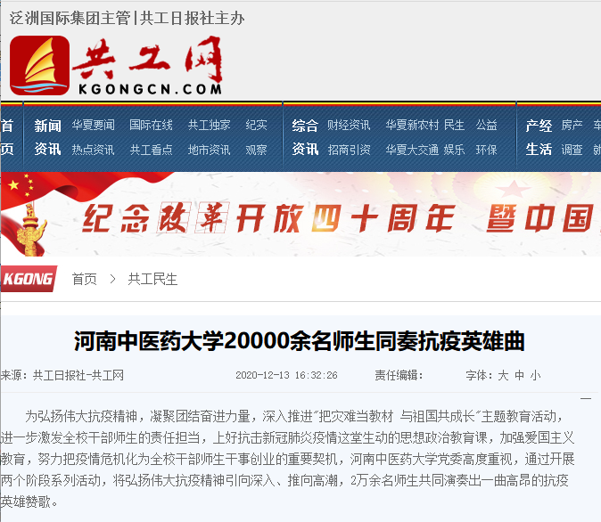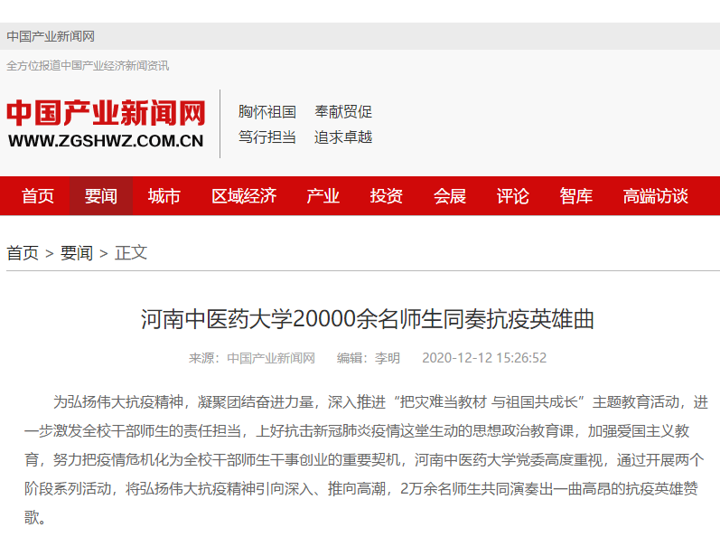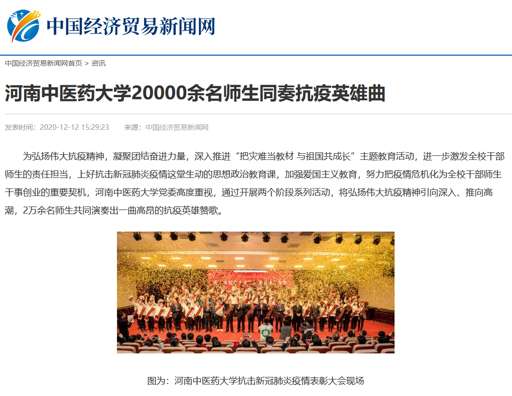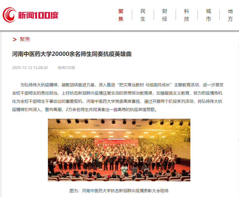 编者按:2020年12月11日-14日,人民日报、人民日报海外网、中国网、中华网、央广网、中国教育网、中央广播电视总台国际在线、中闻网、中报网、中国医学新闻网、中国医药新闻网、中华高校网、中国资源新闻网、中国产业新闻网、中国文化信息传播网、中国企业经济网、中国经济贸易新闻网、大河网、顶端新闻、中科信息创新网、网易河南、河南高校资讯网、中原经济网、豫网、中华网、今日头条、搜狐新闻、一点资讯、腾讯-天天快报、凤凰新闻、西部头条网、共工网、中国县域频道、上游新闻、澎湃号、东方新闻、旅游中国网、中关村经济发展网、智能高科新闻网、燕赵新闻网、新闻100度、消费日报、中国轻工业网等数十家媒体对leyu·乐鱼(中国)体育官方网站弘扬伟大抗疫精神的特色做法和显著成效进行广泛报道。