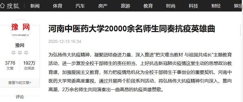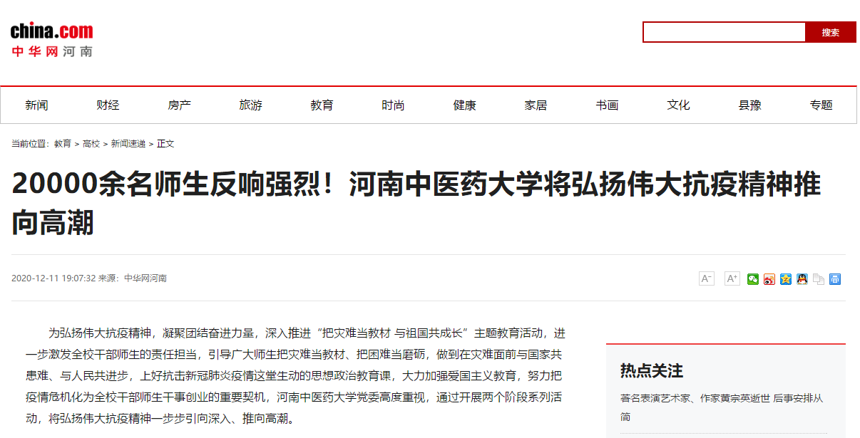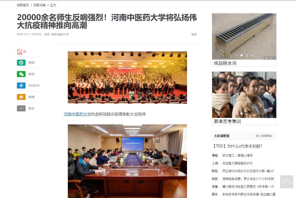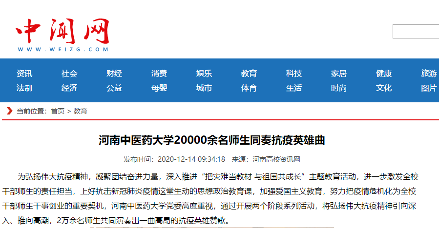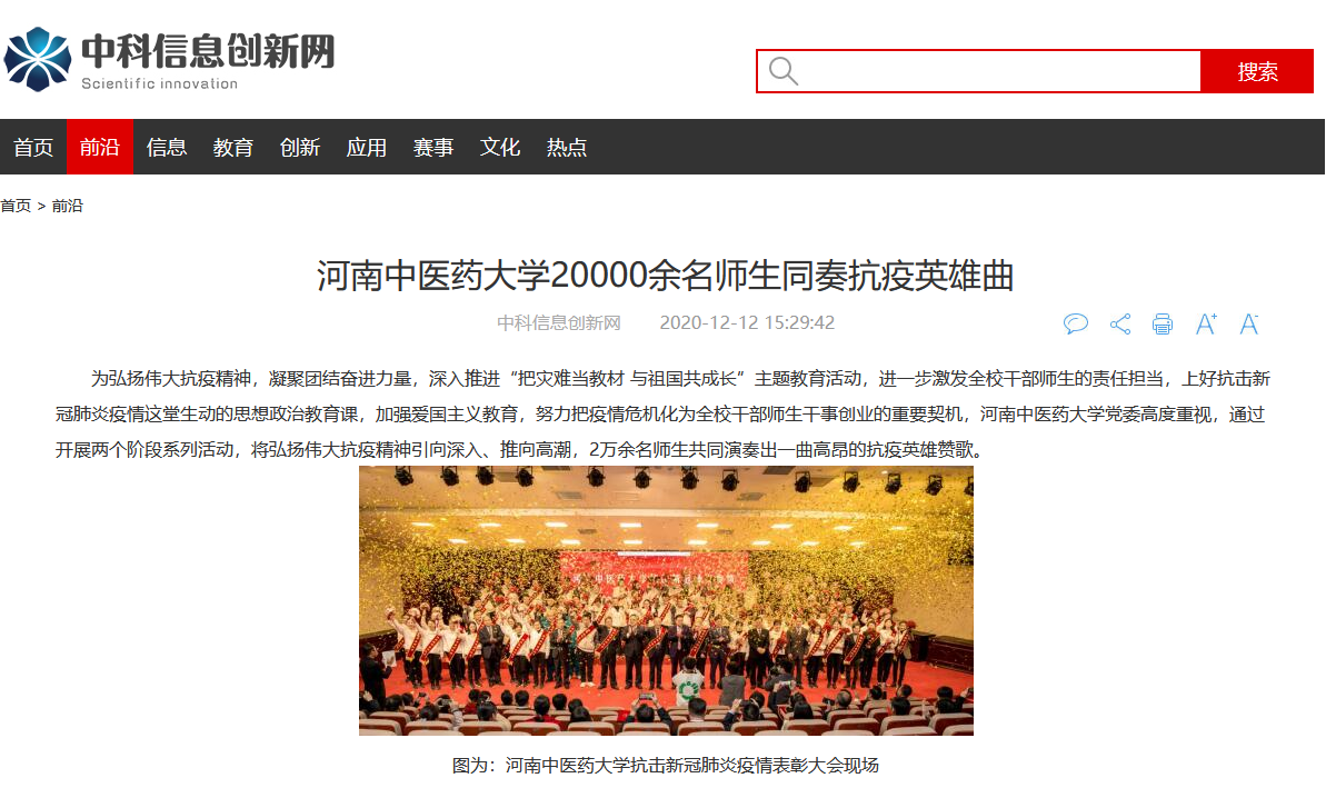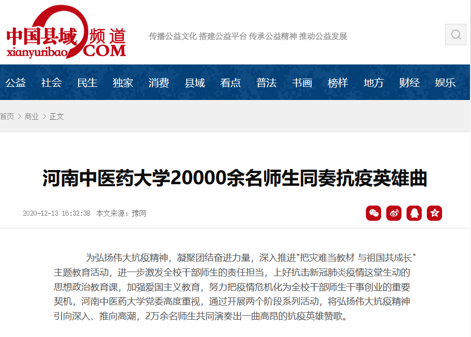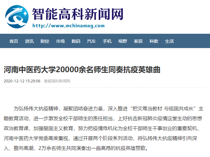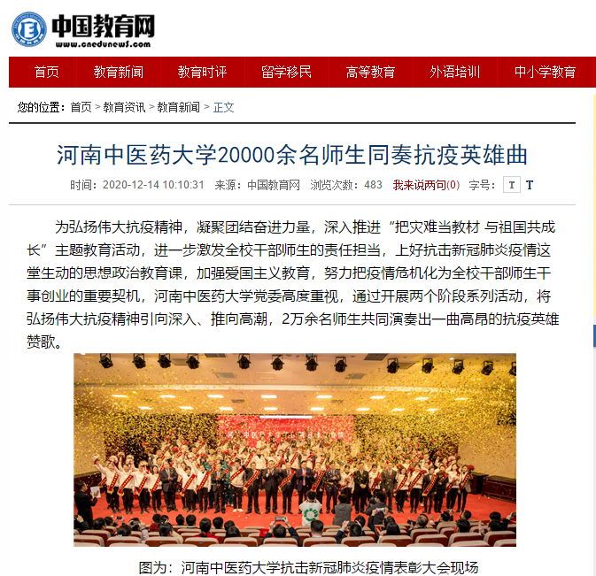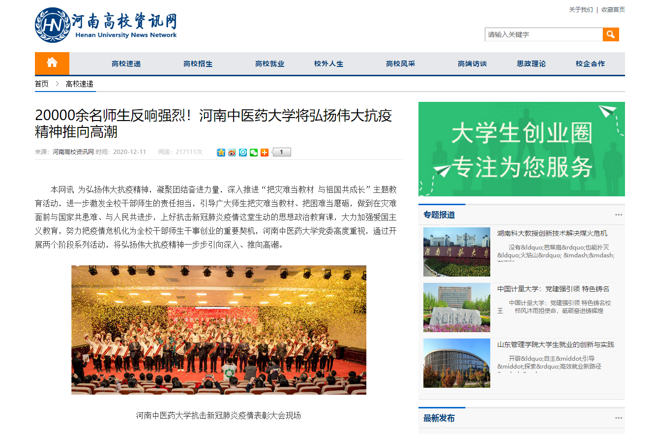 编者按:2020年12月11日-14日,人民日报、人民日报海外网、中国网、中华网、央广网、中国教育网、中央广播电视总台国际在线、中闻网、中报网、中国医学新闻网、中国医药新闻网、中华高校网、中国资源新闻网、中国产业新闻网、中国文化信息传播网、中国企业经济网、中国经济贸易新闻网、大河网、顶端新闻、中科信息创新网、网易河南、河南高校资讯网、中原经济网、豫网、中华网、今日头条、搜狐新闻、一点资讯、腾讯-天天快报、凤凰新闻、西部头条网、共工网、中国县域频道、上游新闻、澎湃号、东方新闻、旅游中国网、中关村经济发展网、智能高科新闻网、燕赵新闻网、新闻100度、消费日报、中国轻工业网等数十家媒体对leyu·乐鱼(中国)体育官方网站弘扬伟大抗疫精神的特色做法和显著成效进行广泛报道。