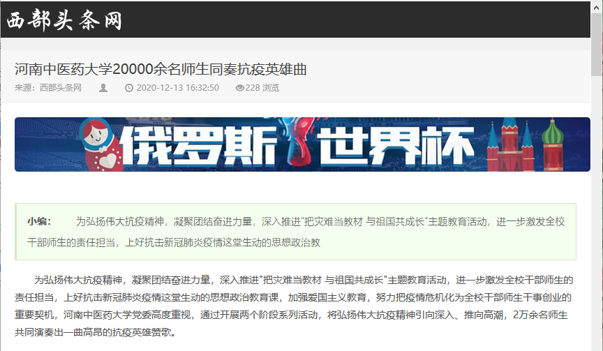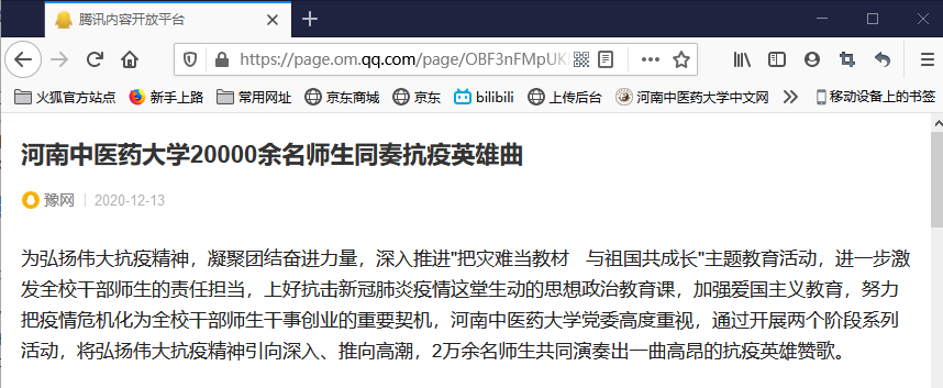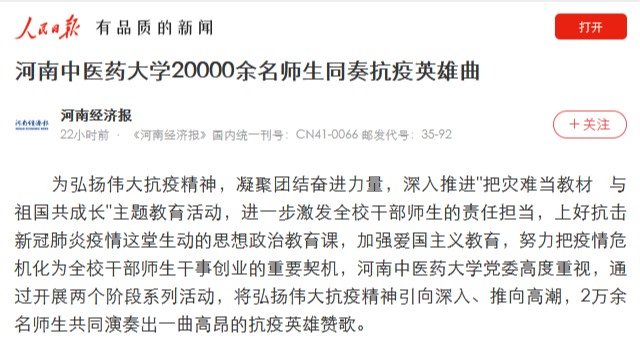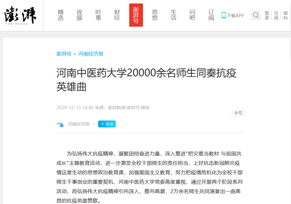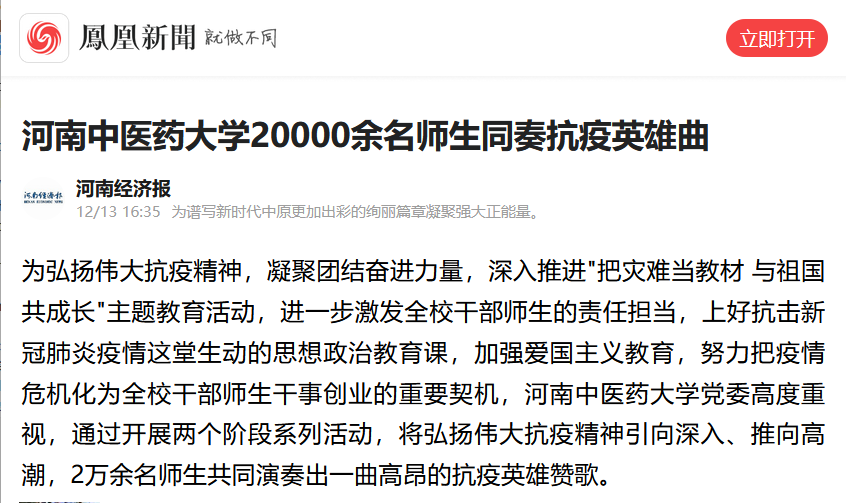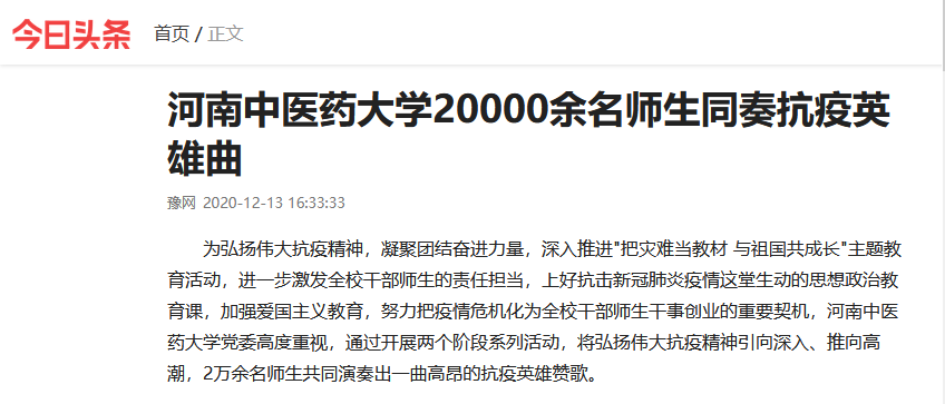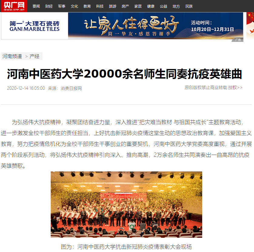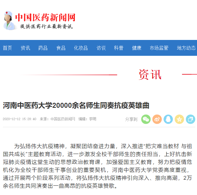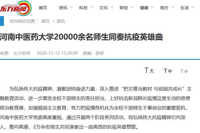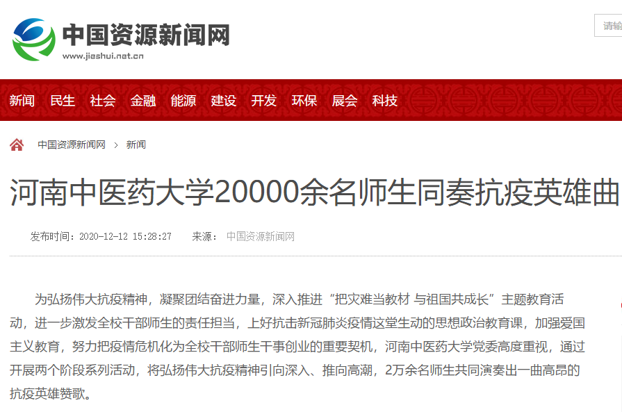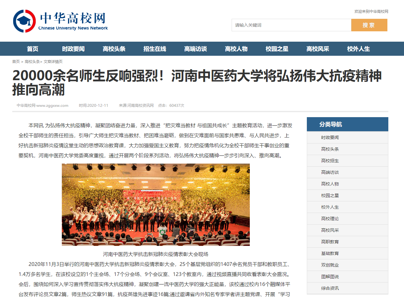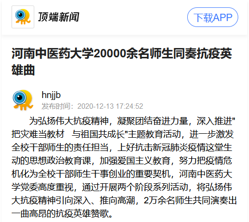 编者按:2020年12月11日-14日,人民日报、人民日报海外网、中国网、中华网、央广网、中国教育网、中央广播电视总台国际在线、中闻网、中报网、中国医学新闻网、中国医药新闻网、中华高校网、中国资源新闻网、中国产业新闻网、中国文化信息传播网、中国企业经济网、中国经济贸易新闻网、大河网、顶端新闻、中科信息创新网、网易河南、河南高校资讯网、中原经济网、豫网、中华网、今日头条、搜狐新闻、一点资讯、腾讯-天天快报、凤凰新闻、西部头条网、共工网、中国县域频道、上游新闻、澎湃号、东方新闻、旅游中国网、中关村经济发展网、智能高科新闻网、燕赵新闻网、新闻100度、消费日报、中国轻工业网等数十家媒体对leyu·乐鱼(中国)体育官方网站弘扬伟大抗疫精神的特色做法和显著成效进行广泛报道。