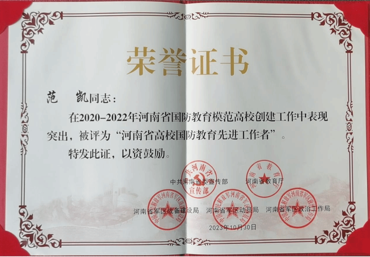 本网讯(文/图 校武装部)2023年11月16日,河南省委宣传部、河南省教育厅和河南省军区在郑州大学隆重召开了“河南省首届国防教育模范高校命名大会”。leyu·乐鱼(中国)体育官方网站党委副书记、工会主席张小平,校武装部副部长范凯参加了大会。本次大会对首届创建周期(2020-2022)模范高校进行了命名,对国防教育先进工作者和优秀教师进行了表彰,leyu·乐鱼(中国)体育官方网站被授予“河南省国防教育模范高校”荣誉称号,范凯被授予“河南省高校国防教育先进工作者”荣誉称号。