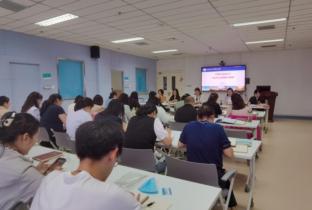 本网讯(图/杨雪 文/张璟)2022年8月28日下午15:00,护理学院《习近平谈治国理政》第四卷专题学习会在实训楼1017会议室召开,全体教职工参加了学习。会议由护理学院党委书记尹丽主持。