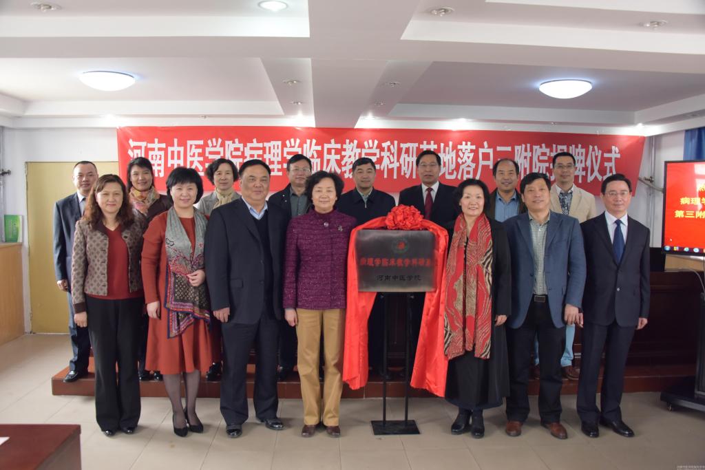 2015年4月11日,河南中医学院病理学临床教学科研基地揭牌仪式在三附院行政楼三楼会议室举行。学校校长郑玉玲,副校长许二平、张小平,校党政办、宣传部、学科办、教务处、科技处、计财处,以及三附院党委书记李庆海、院长田力、党委副书记郭书敏、副院长叶险峰、临床及行政科室主任、病理学科研基地全体人员参加仪式。仪式由许二平副校长主持,郑玉玲校长、病理学临床教学科研基地负责人徐玉芳以及三附院院长田力分别在仪式上讲话。