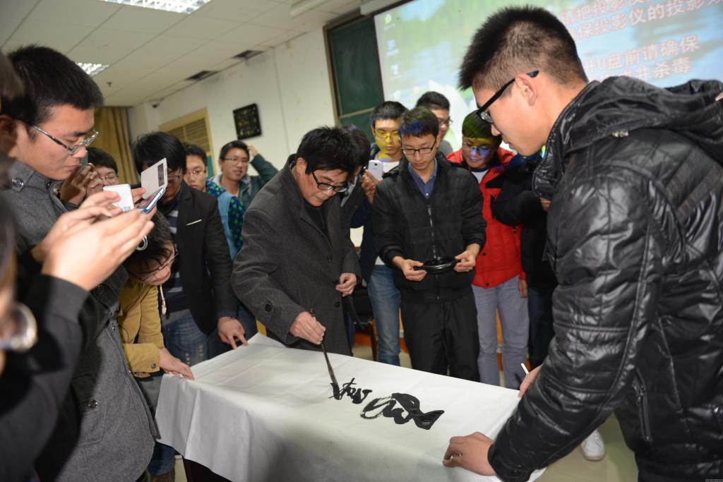 随着生活水平的不断提高,书法价值也逐渐凸现出来,学习书法的重要性也不断被人们所认识,leyu·乐鱼(中国)体育官方网站新生学习书法的热情尤为高涨。根据大学生书画协会的请求,关工委、书画院怀着对下一代诚挚的爱心,为同学们请来了实践经验丰富、书法水平、讲授水平较高的老师。对于如何学习书法、楷书的基本技法进行讲解。朱教授在讲座中从学习书法的重要意义,书法弘扬正气震慑邪恶的作用,书法的实用性着手,介绍学习书法的途径可以从行书入手,注意临摩名家作品,如天下第一行书王羲之的“兰亭序”,进而学习篆书,李斯的小篆一统天下。再学草书,张芝被尊为草圣,就要懂得他的作品等。朱教授两个小时的讲座讲得明白,同学们听得认真,看得清楚。最后朱教授还进行了书法表演。