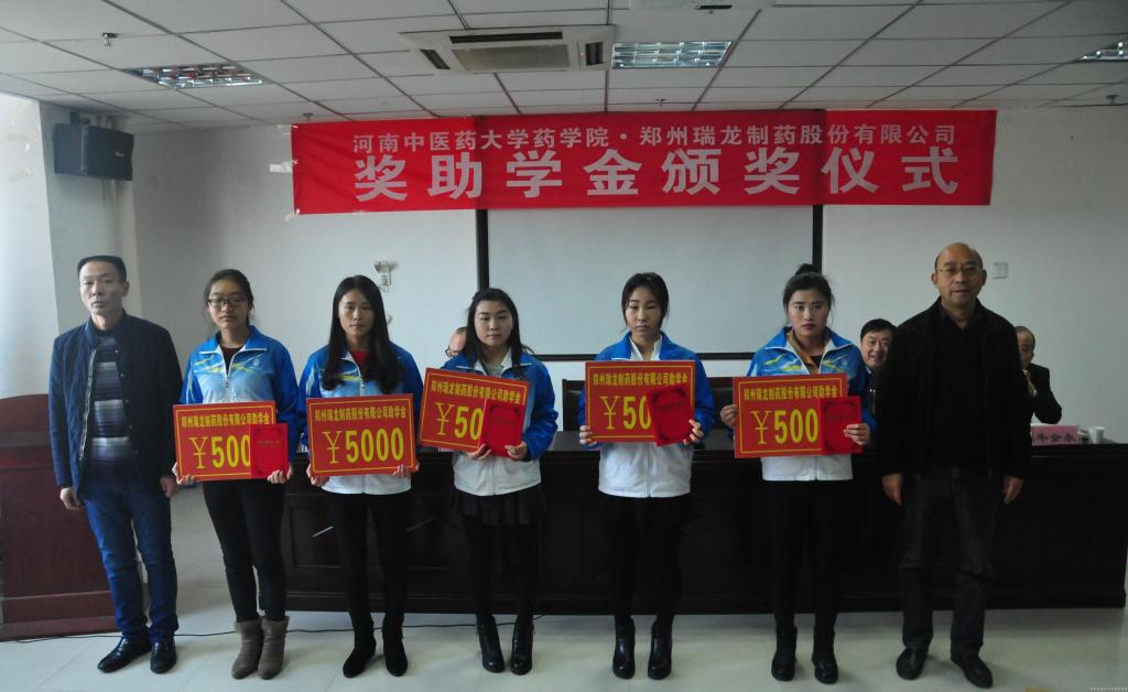 药学院党委副书记杨文胜宣布了第四届瑞龙奖助学金表彰决定。经过班级评定、资助工作小组审核、年级公示,在药学院中药专业5名学生获得瑞龙奖学金、5名学生获得瑞龙助学金。随后,副校长冯卫生为获得瑞龙奖助学金的10名同学颁发荣誉证书,郑州瑞龙制药股份有限公司总经理王洪涛为同学们颁发奖金。
