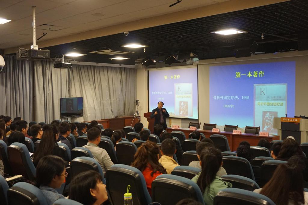 随后,宣讲专家孙永强教授作了《无影灯下的中医情怀》的讲座,他从第一本著作的手稿讲起,到后来发表的大量的核心期刊的论文和出版的著作;从第一个国家发明创造髌骨抱聚器,到后来的各种骨骼异型钢板和膏药制剂,用自己的成长发展经历向同学们展示了作为一名临床工作者,是如何以临床为基础开展科研工作的。他希望大家用一颗平常心去对待每一件事情,要诚信做人,严谨做事,不断学习,恪守学术道德,远离学术不端等腐败行为,学术研究工作才会有生命力。