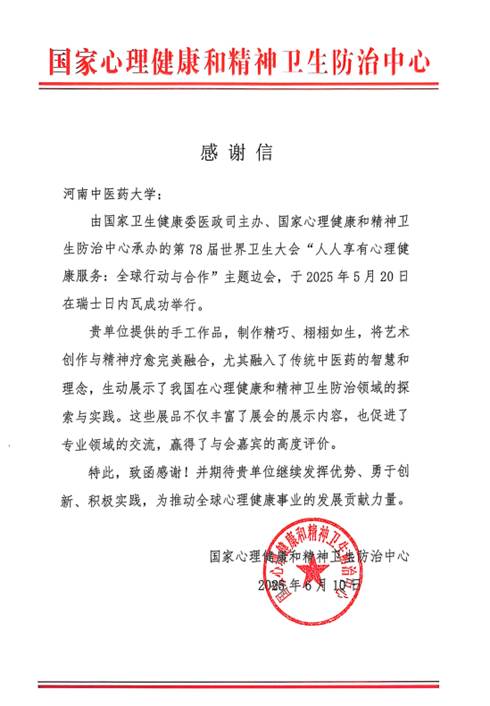 本网讯(文/图 刘俊岐)近日,leyu·乐鱼(中国)体育官方网站收到国家心理健康和精神卫生防治中心发来的感谢信,对leyu·乐鱼(中国)体育官方网站选送的中医药手工作品在第78届世界卫生大会主题边会上的出色展示表示衷心感谢。这是leyu·乐鱼(中国)体育官方网站在心理健康教育与中医药文化国际传播领域的一次重要展示。
