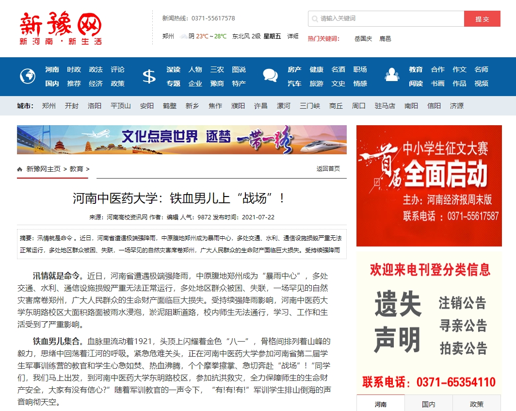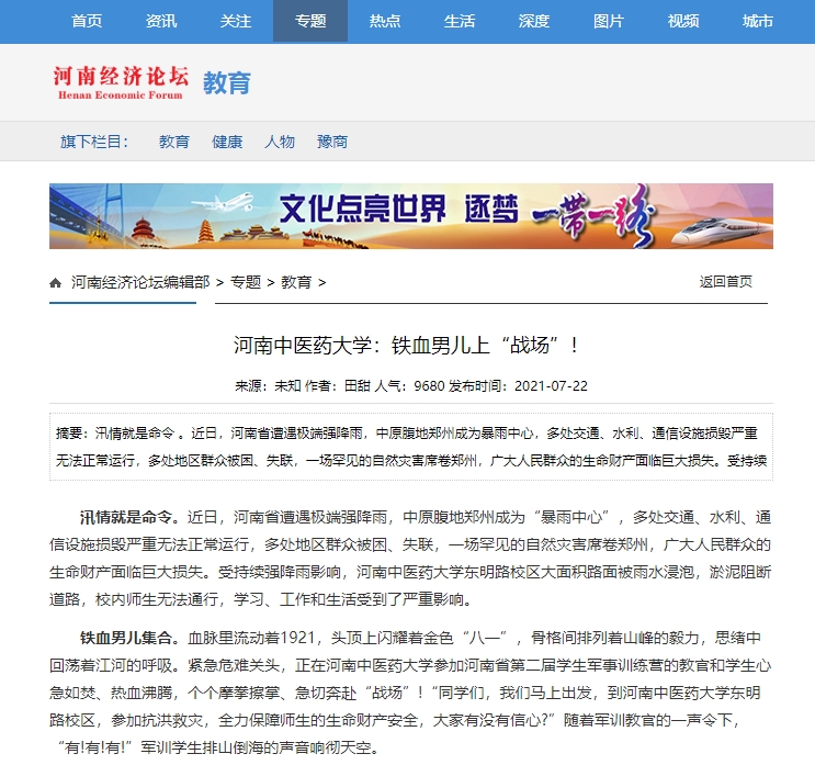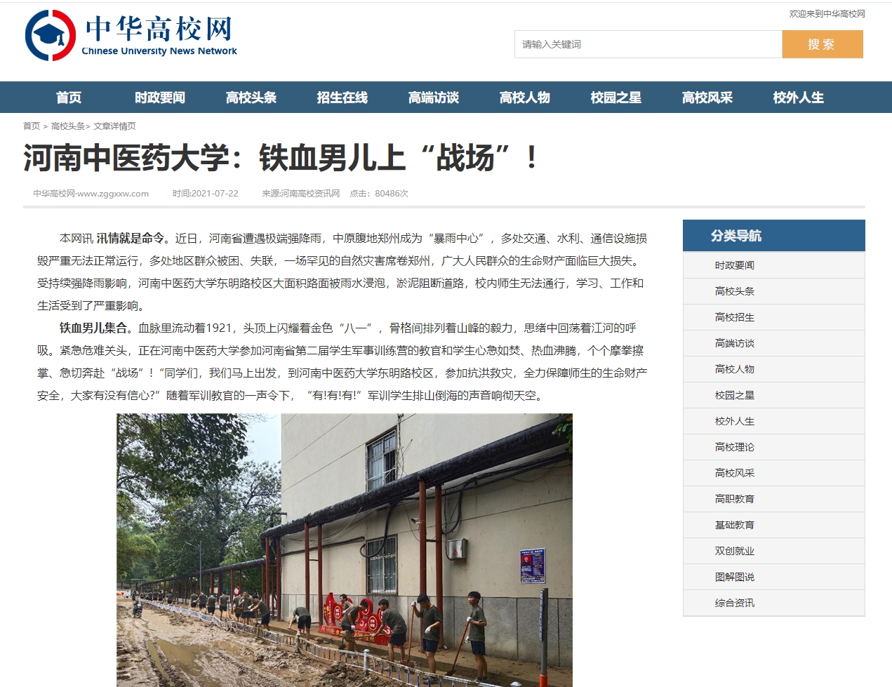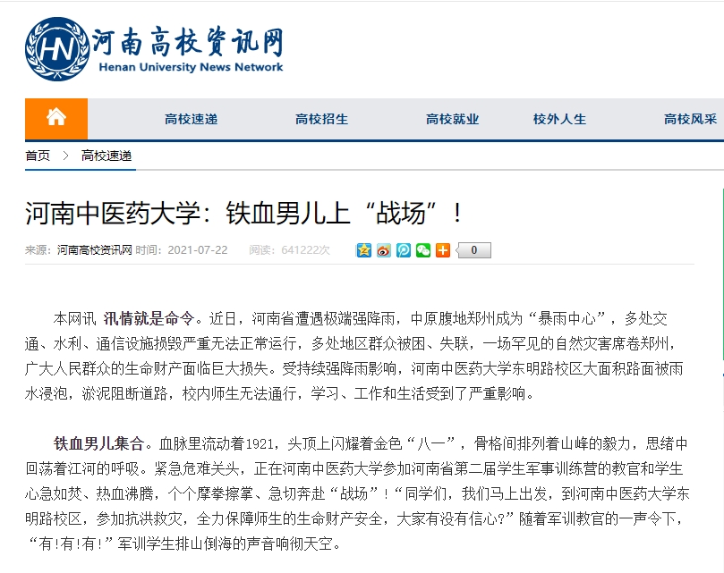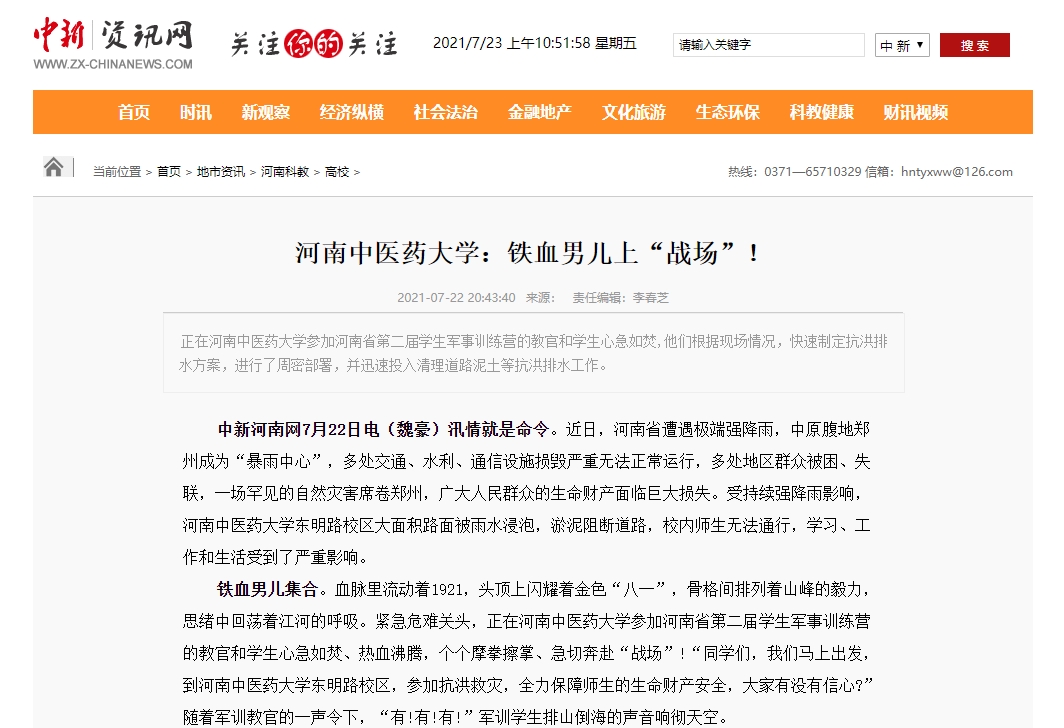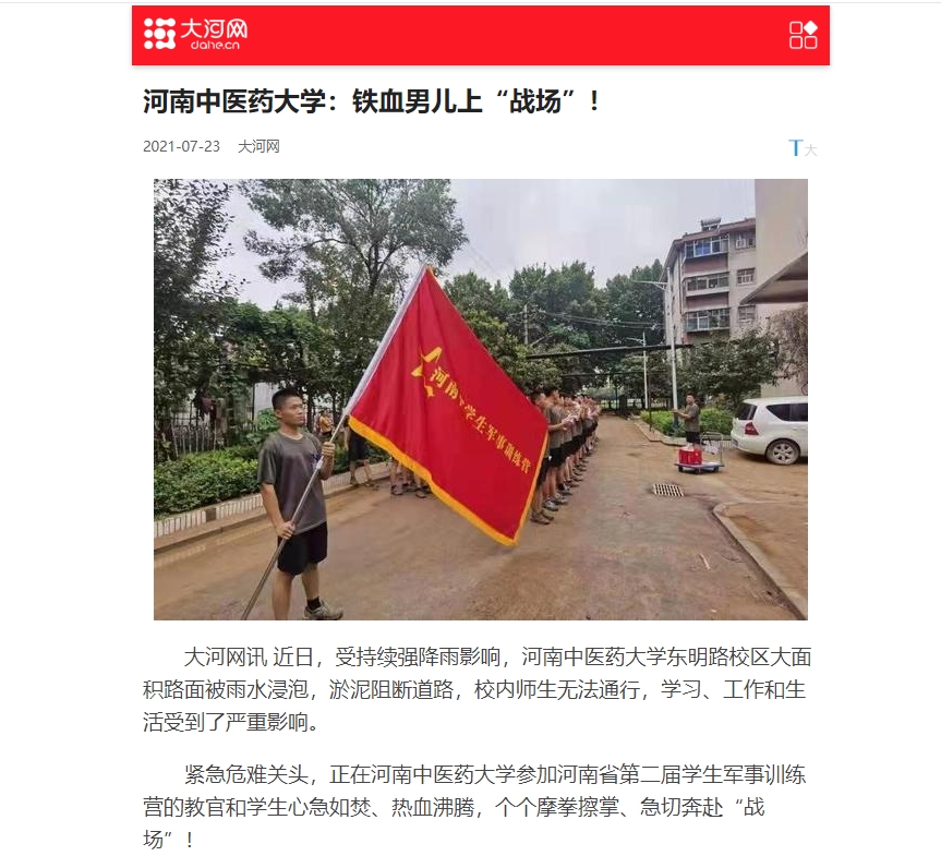 编者按:2021年7月23日,人民日报客户端、大河网、中华高校网、中新资讯网、河南高校资讯网、新豫网、河南经济论坛等多家媒体对正在leyu·乐鱼(中国)体育官方网站参加河南省第二届学生军事训练营的教官和学生到东明路校区参加抗洪救灾,全力保障师生的生命财产安全一事进行报道。