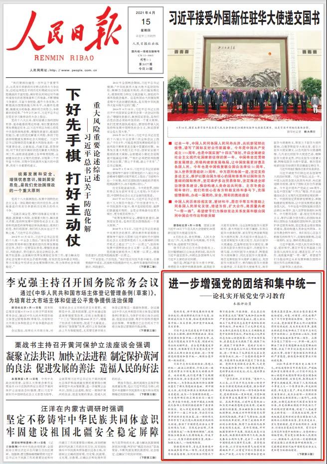 习近平总书记在党史学习教育动员大会上强调,旗帜鲜明讲政治、保证党的团结和集中统一是党的生命,也是我们党能成为百年大党、创造世纪伟业的关键所在。在全党开展党史学习教育,就要教育引导全党从党史中汲取正反两方面历史经验,进一步增强党的团结和集中统一,确保全党步调一致向前进。