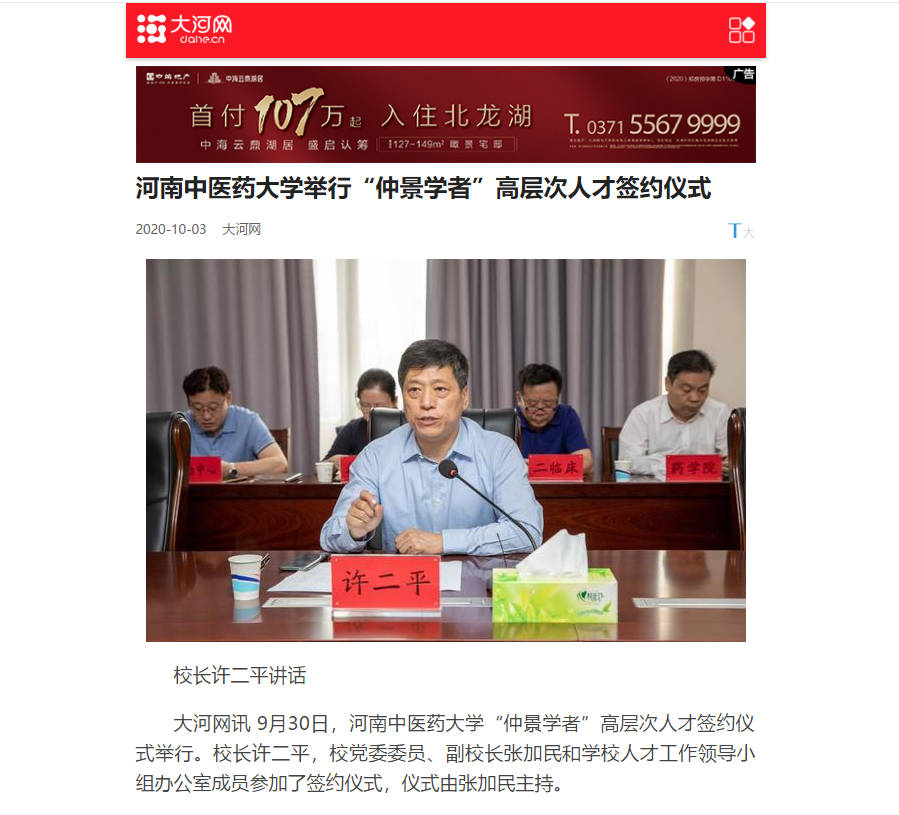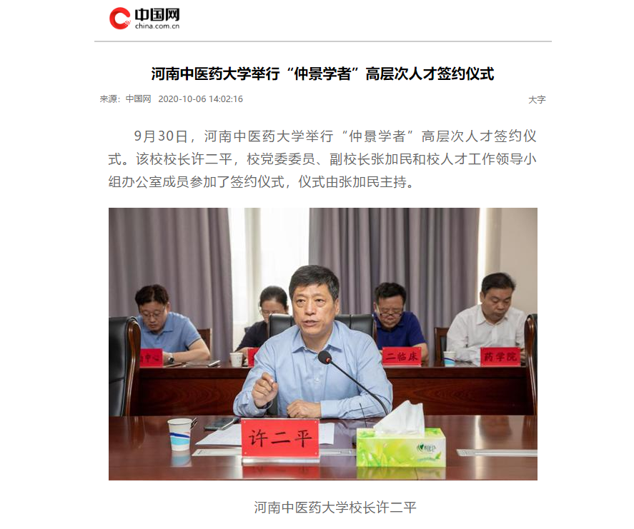 2020年10月3日-6日,中国网、大河网、网易新闻对leyu·乐鱼(中国)体育官方网站举行“仲景学者”高层次人才签约仪式进行报道。