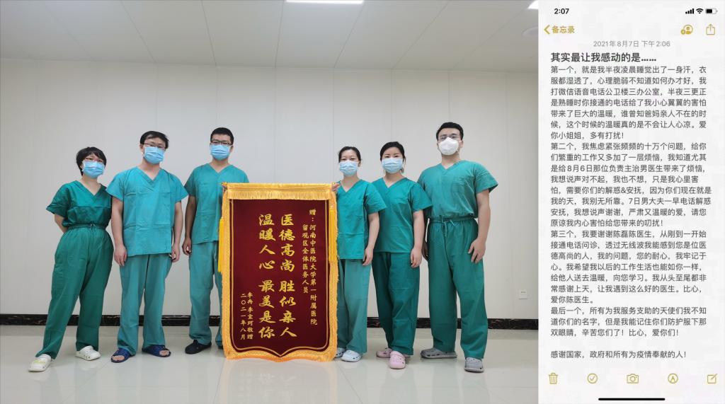陈磊医师是一附院第十一批次进驻隔离病区的医师,从事医疗工作二十余年,在平凡的岗位上兢兢业业、任劳任怨、刻苦钻研,得到了患者的赞誉、同事的好评。今年她积极申请到抗疫一线工作,进入隔离病房,收治患者中有感染阿尔法变异病毒株及贝塔病毒变异型株感染的确诊患者,也有筛查的患者,无论那种患者,她都认真救治,关心患者病情、情绪,耐心引导、积极用药,获得患者认可,患者写下了感谢信,返乡后千里之外寄来锦旗。
