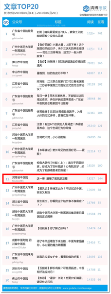 中医医院服务号文章TOP20排行榜