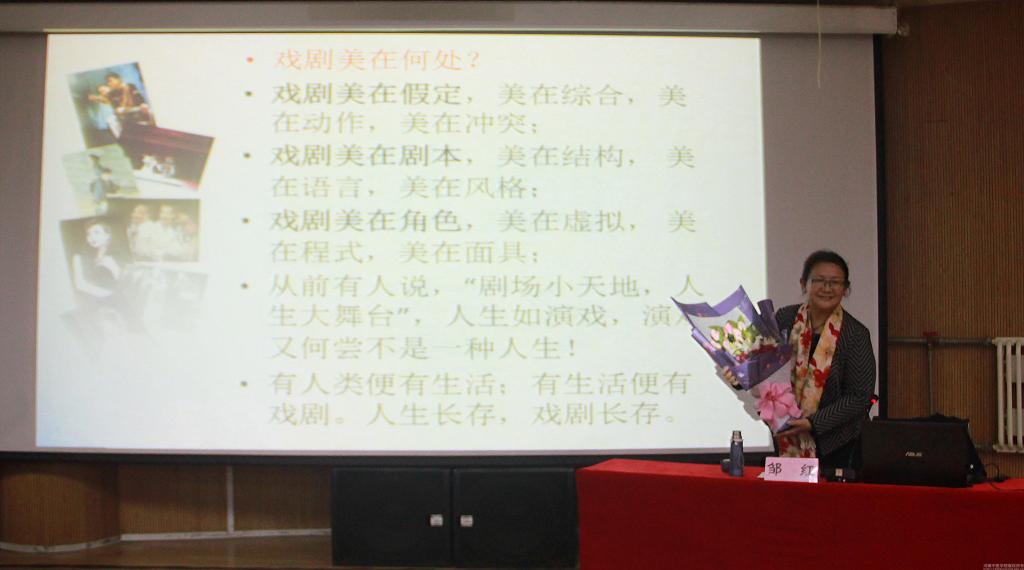 报告中,邹红教授主要从“戏剧美在哪里”、“话剧的结构之美”、“戏曲的写意之美”三个方面对戏剧艺术的魅力进行了深入的阐述。首先邹红教授从时间艺术和空间艺术两个角度阐述了戏剧与诗歌、小说、音乐、绘画等艺术形式的不同,并从价值观、创作能力、身心健康、合作与纪律、审美能力等五个方面论述了要重视戏剧教育的原因。随后,邹红教授介绍了包括开放式、锁闭式、人像展览式、散文式和戏中戏式的话剧五种结构,并详细讲解了每种结构的优势和劣势。最后,邹红教授向大家解释了戏曲的写意和程式化,并从“空间、环境、时间”三个方面介绍了传统戏曲的虚拟现象。在讲授的过程中,邹红教授通过播放话剧《第一次亲密接触》及京剧《秋江》视频,给大家具体讲解戏剧剧本前后呼应、步步伏笔的结构之美以及戏剧舞台上有无虚实之间巧妙的转换方式、演员来源于生活又高于生活的舞蹈表演方式,使在场学生更加直观、真切地感受到戏剧的魅力。整场报告会生动形象,现场气氛热烈,赢得了同学们的阵阵掌声。