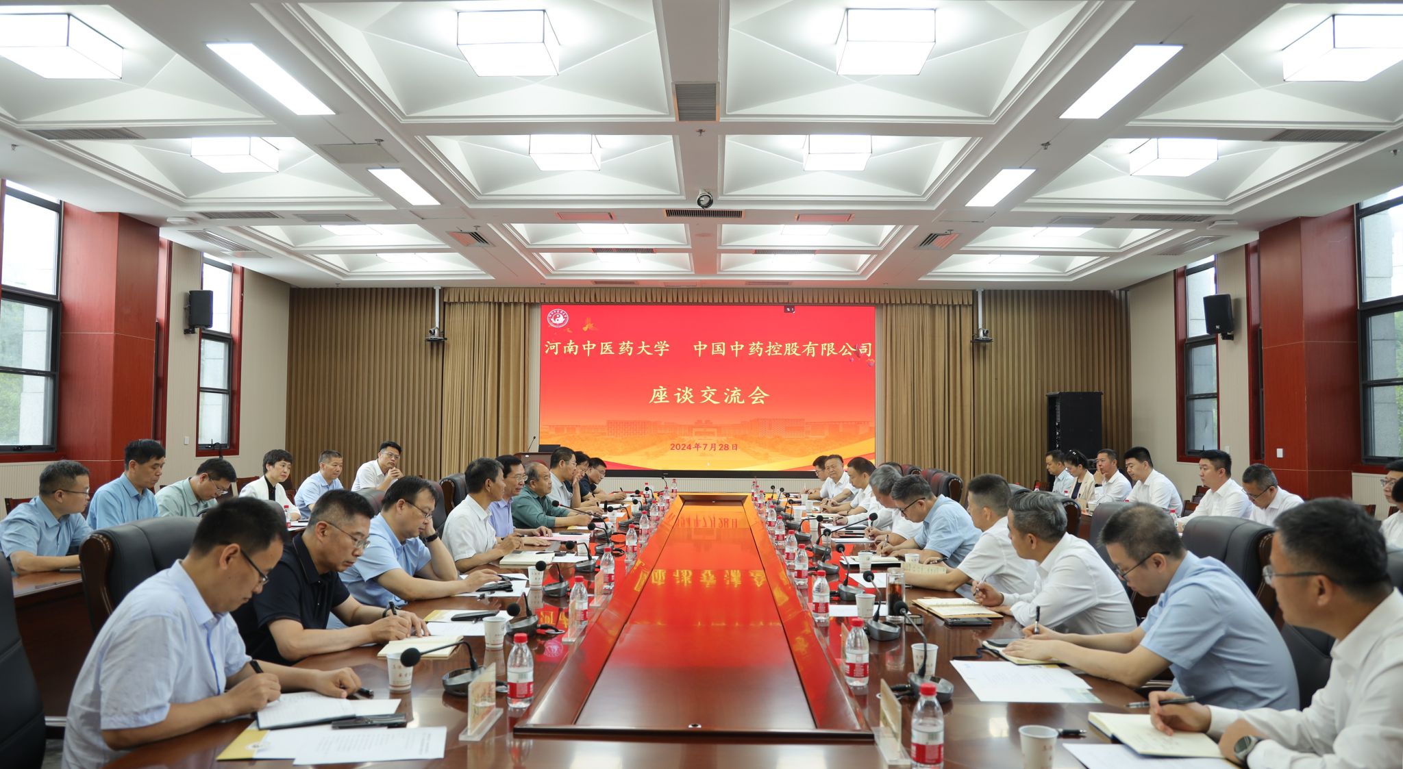 本网讯(文/图 张明远)2024年7月28日,中国中药控股有限公司党委书记、董事长陈映龙携广东一方制药有限公司总经理张军、江阴天江药业有限公司党委书记、总经理王龙虎等一行来校考察交流。校长王耀献,副校长苗明三、张振强出席座谈交流会,教务部、科学技术处、社会合作办公室、药学院、一附院、二附院、三附院等部门负责同志参加了本次会议。会议由苗明三主持。